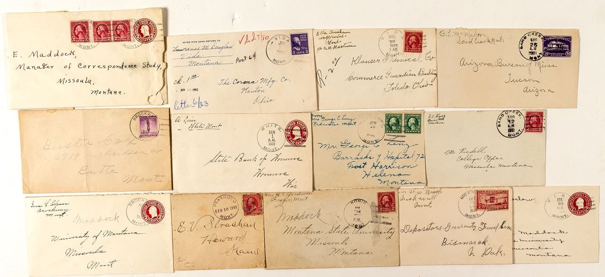 Thirteen total. Includes 1915 White (1914-1917). Has a letter (railroad expected soon, store and post office keep me busy). The letter is from Anton Liver - the first and only White post master. Also includes two ten year post offices: very early 1892 Pearmond (1891-1901) and Redwater (1911-1921). Also 1920 (?) Bonin (1917-1933), Nickwall, Brockway, Sand Creek, White, Vida. City: State: Montana Date: 1892-1952 ID: 37010