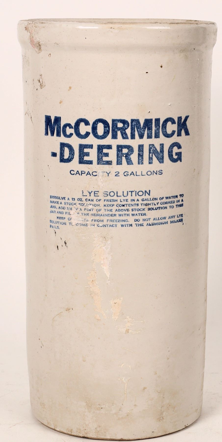 McCormick-Deering Lye 2 gallon stoneware. 15x7.5". 1" round hole in base.