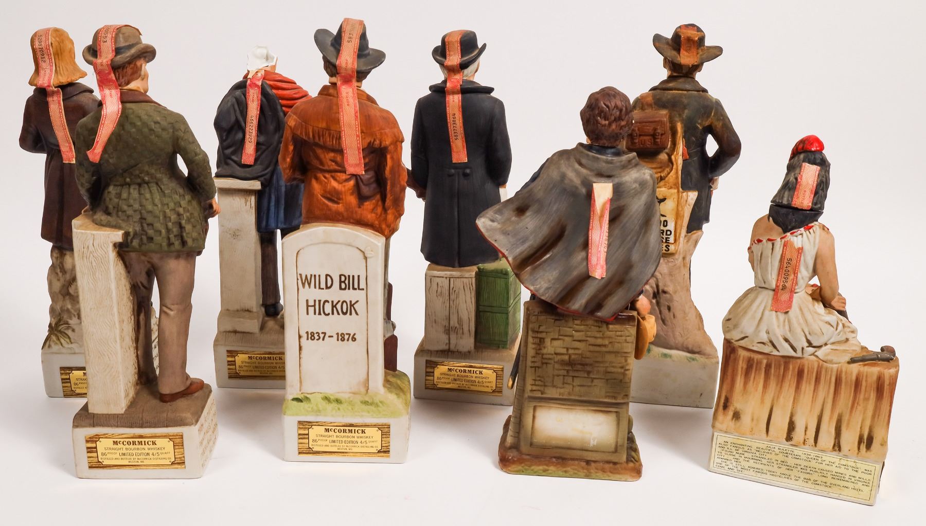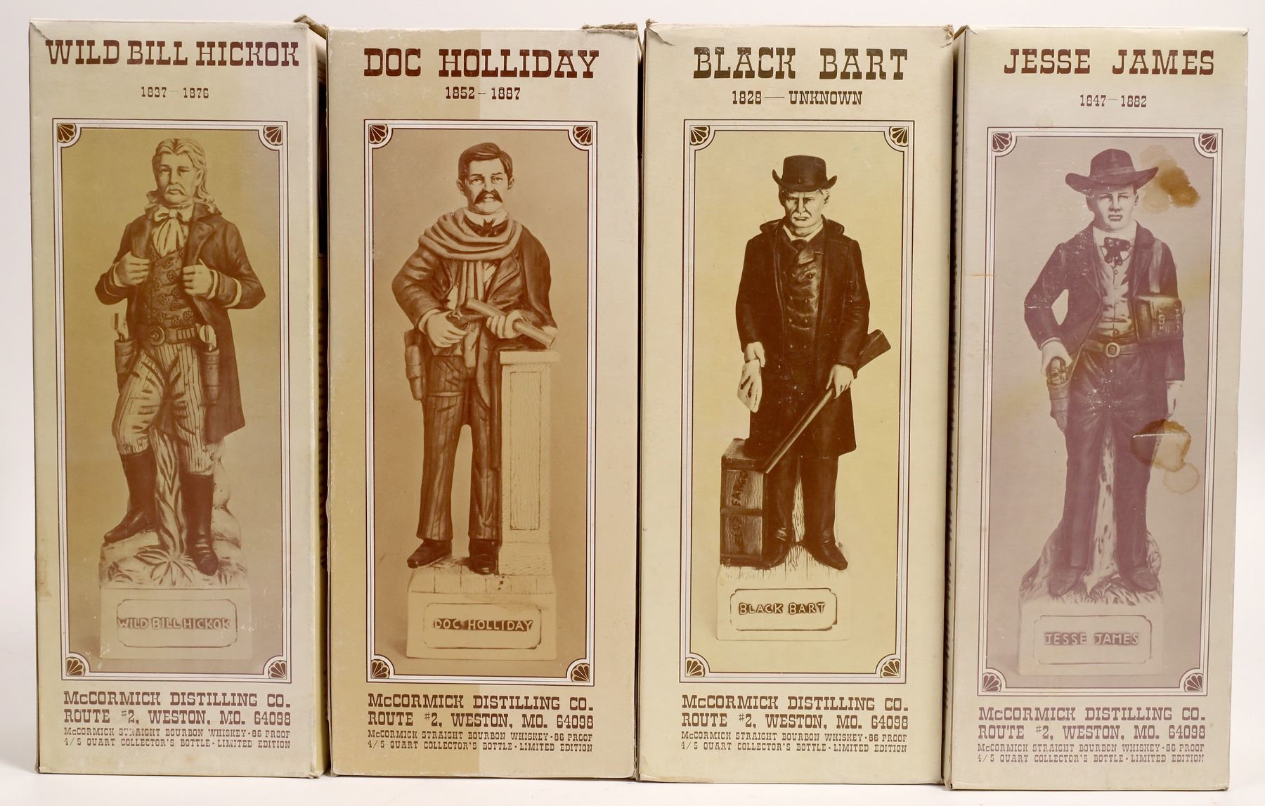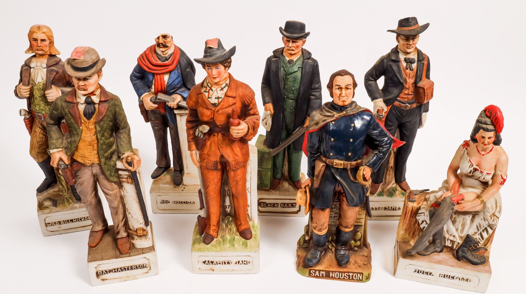 8 different gunfighter decanters in original boxes, plus Sam Houston. Wild Bill Hickok, box stained, top 1" tear, with seal. Doc Holliday-head broken and included. Black Bart-stained box, torn top, broken seal. Jesse James-stained box, no contents. Calamity Jane-box top has 2 1" tears, original seal. Bat Masterson-box stained, box top wear, original seal. Very rare Julia Bulette, broken seal, no contents. Sam Houston-box has wear, broken seal and no contents. Wyatt Earp, box stained and 4" tear, original seal, some contents. Local pickup preferred.