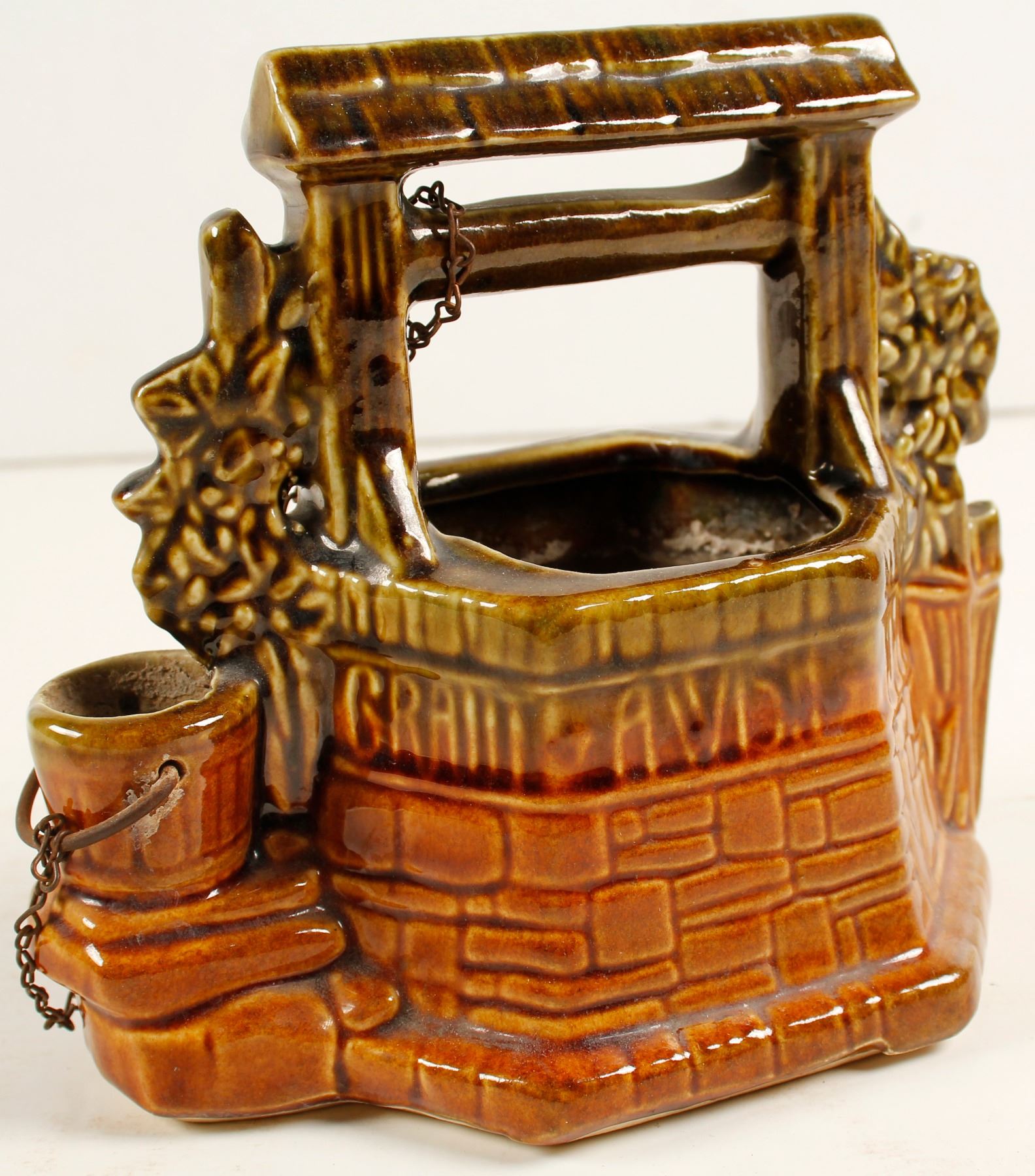 "Grant a Wish To Me" around the top edge, green and brown glaze, bucket chain intact. 6.5 x 7"