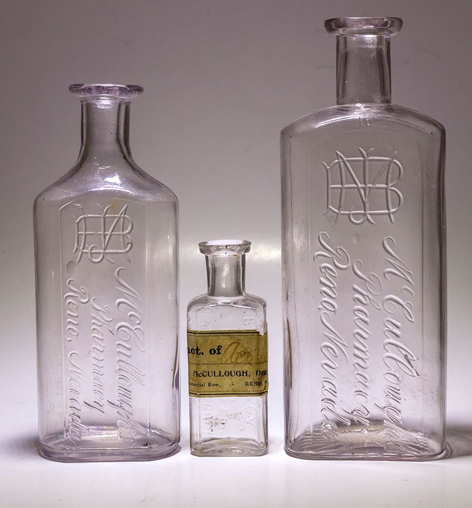 3 different clear medicines. 3.5" rectangular J. B. McCULLOUGH / DRUGGIST / RENO, NEVADA with paper rear label. 6.25" oval McCullough's / Pharmacy / Reno, Nevada. 7.25" rectangular McCullough's / Pharmacy / Reno, Nevada. No visible chips or cracks. Holabird pages 197-198, book examples. Date: c. 1891-1905 Location: Reno, Nevada HWAC# 57941