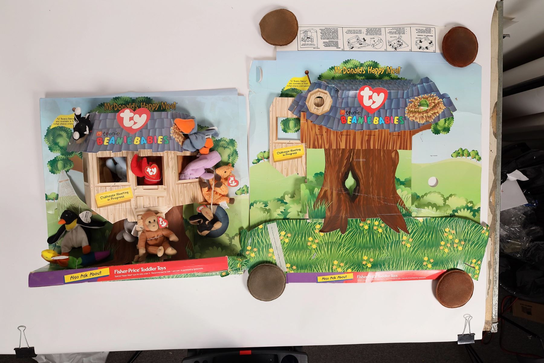 1998 McDonald's Beanie Baby cardboard display with 12 Beanie Babies. 19x23" cardboard display with 12 mounted babies and rolled up second cardboard display.