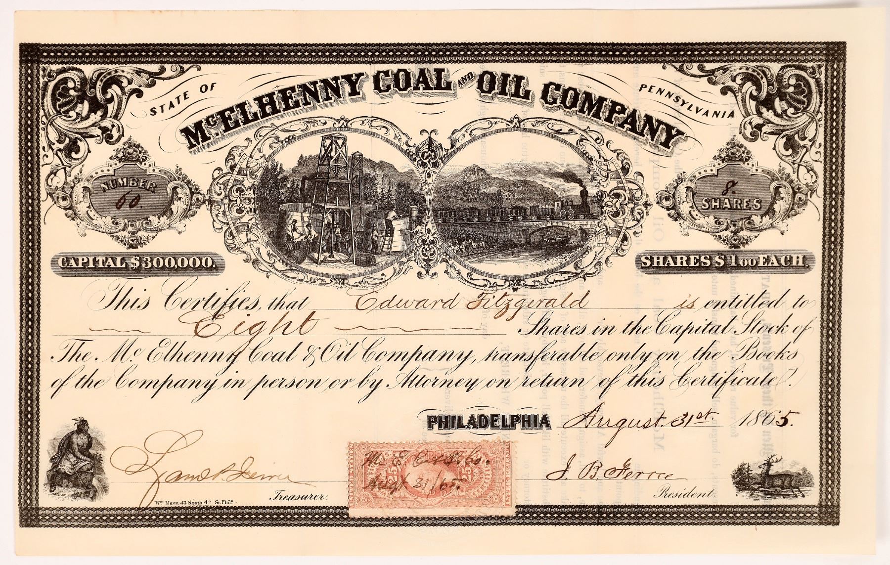 Inc. in Pennsylvania. No. 60, issued for 8 shares to Edward Fitzgerald in 1865 in Philadelphia. Signed by president James B. Ferree and the treasurer. Not cancelled. Black border and print. Double oval vignette of men loading oil barrels from tanks with a coal train in the background crossing a bridge. Two smaller vignettes in bottom corners: Native American and elk. Printed by Wm. Mann, Philadelphia. 25 cent US IR certificate stamp attached at bottom center. 6.25 x 10" Folds, clean. According to a February 21st, 1865 York Gazette article, the company purchased 121 acres of coal and oil land near French Creek and Franklin in Venango County, Pennsylvania. The coal vein is five feet thick.