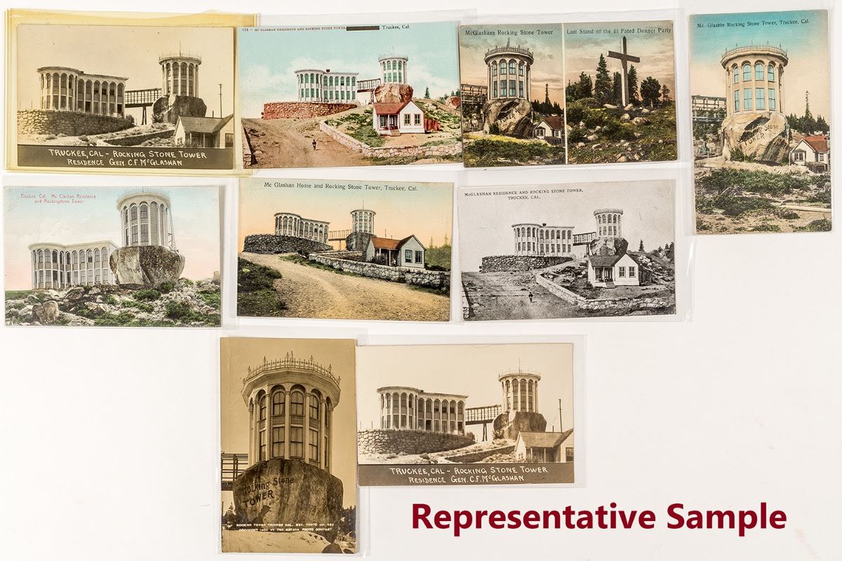 35 cards. Earliest is post marked 1903. One card from 1905 states, "Waiting for a train here now. Dead Town," One "Missent to New York." 1906 Burckhalter post marked Truckee card. One card explains that the 12 to 15 ton rock inside the tower can be moved with one finger! A couple of unusual views! many duplicates. Nine RPC's from various viewpoints. Over twenty are 1905-1910. Some are hand colored. (Prag collection) City: Truckee State: California Date: ID# 44041