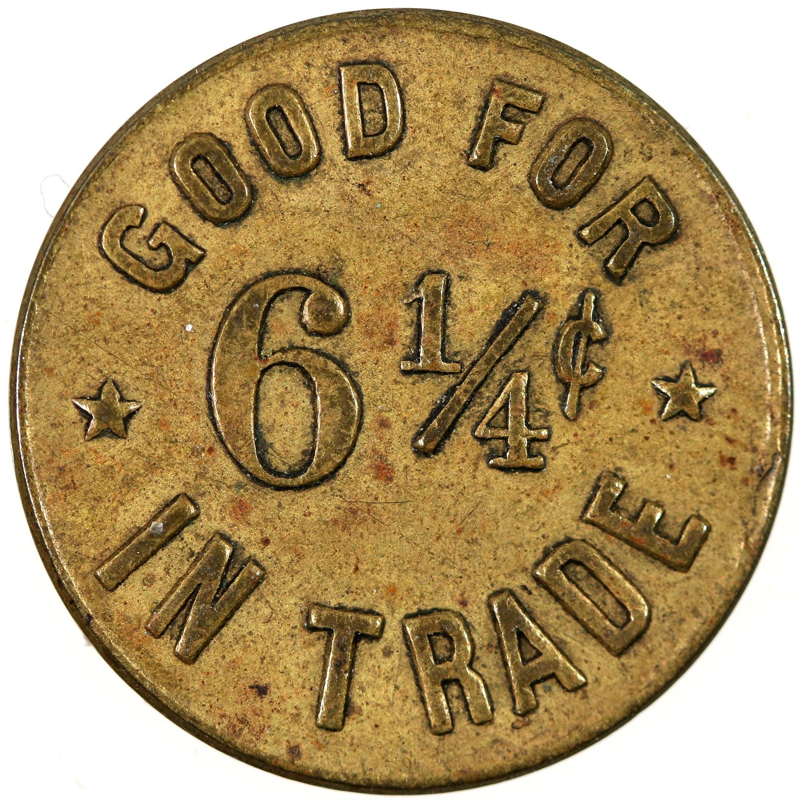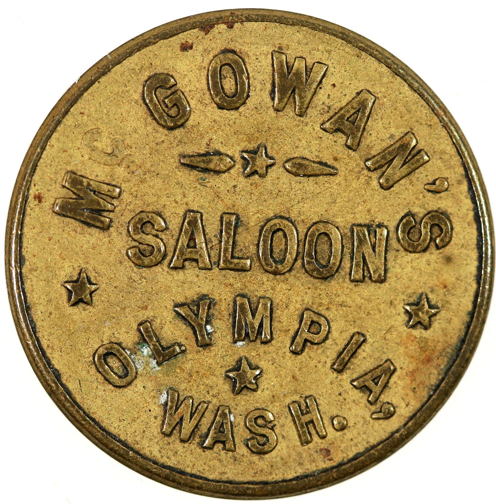 Located at 321 Main Street, 1904-1912: McGOWAN'S / SALOON / OLYMPIA / WN. //GOOD FOR / 6º¢ / IN TRADE; Br., rd., 21 mm, R-6.[ Olympia Washington