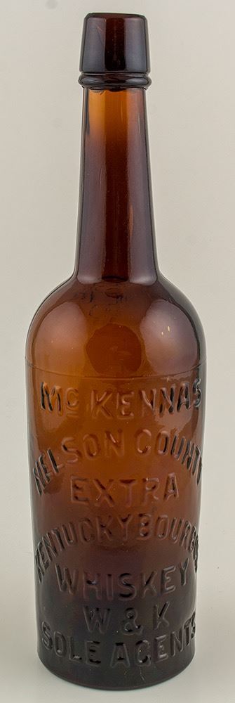 McKenna’s Nelson County Extra Kentucky Bourbon Whiskey, W & K sole agents. Amber applied top whiskey. Four piece mold. This bottle is a choice example. Deep chocolate, sharp features, bright texture, lacking damage. Unarguably, one of the finest known examples. Please inspect; it's a beauty. Thomas number 168. Blank base. Thomas stated that this bottle was at one time as popular as the famous Teakettle Whiskey bottles. One of the reasons would be that it comes in nearly all shades of amber from light yellow to green-amber and chocolate (as is this bottle). Little is known of this company. Not listed in the 1880 Louisville Directory. In the 1880 San Francisco Directory (the 1878, 1887 are similar), there are no specific wholesale liquor distributors with the initials “W & K”. There are three distributors that show the first surname with a “W”, but do not list the partners. These are: Wm. Ward & Co., J. Waterman & C0., and H. Wilhelm & Co. This is one of the rare cases where Thomas had no information and offered no speculation about the merchant history, yet the wide distribution of the bottles indicates a possibly very successful business. More research is needed. City: State: Kentucky Inventory Number: 38924
