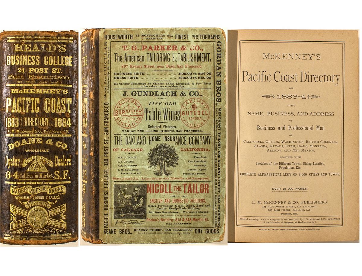 Rare. "Giving Name, Business, and Address of Business and Professional Men of California, Oregon, Washington, British Columbia, Alaska, Nevada, Utah, Idaho, Montana, Arizona, and New Mexico. Together with Sketches of the Different Towns, Giving Location, Population, Etc. Complete Alphabetical Lists of 3,000 Cities and Towns. Over 35,000 Names." L.M. McKenney & Co., Publishers, San Francisco. Printed at Pacific Press Publishing House. Alphabetical index for towns and index to advertisements. 1489 pages. 48 pages of advertisements in front. Large San Francisco section in the beginning, as expected for the time. See also listings for the Comstock (Virginia City, Gold Hill, and Silver City), Sutro, Tahoe area (Glenbrook and Tahoe City), Bodie, Aurora, and many more, along with place specific advertisements. Covers scuffed. Pages toning on outsides, but very readable. Binding fairly tight. An invaluable resource for the Western historian and collector!