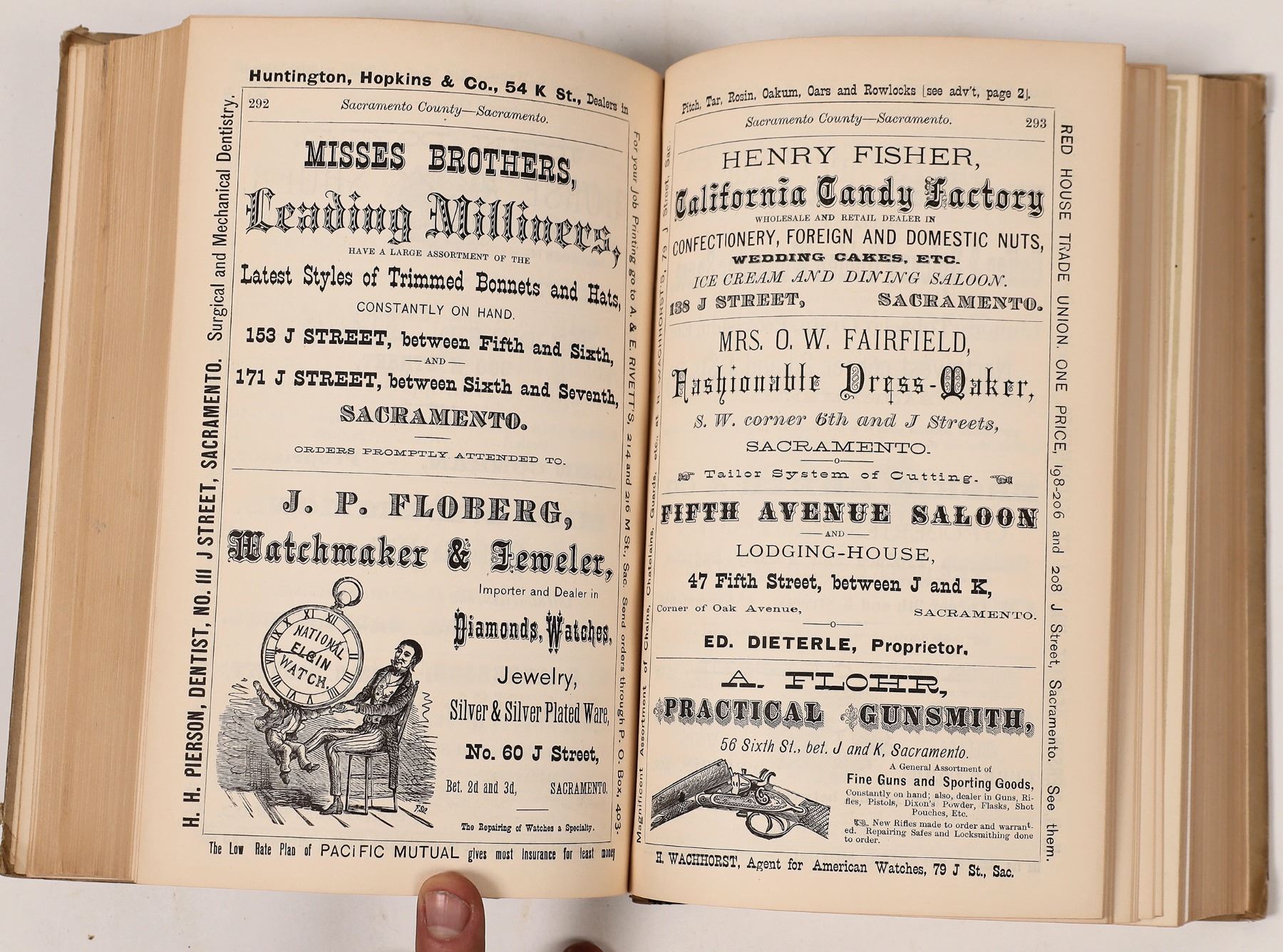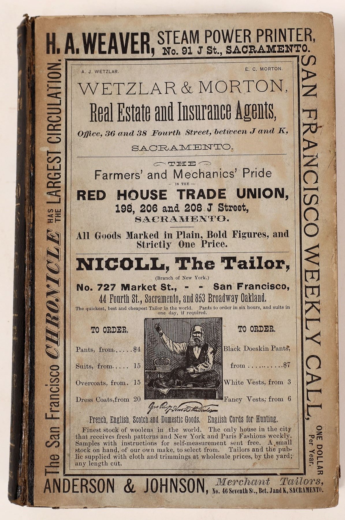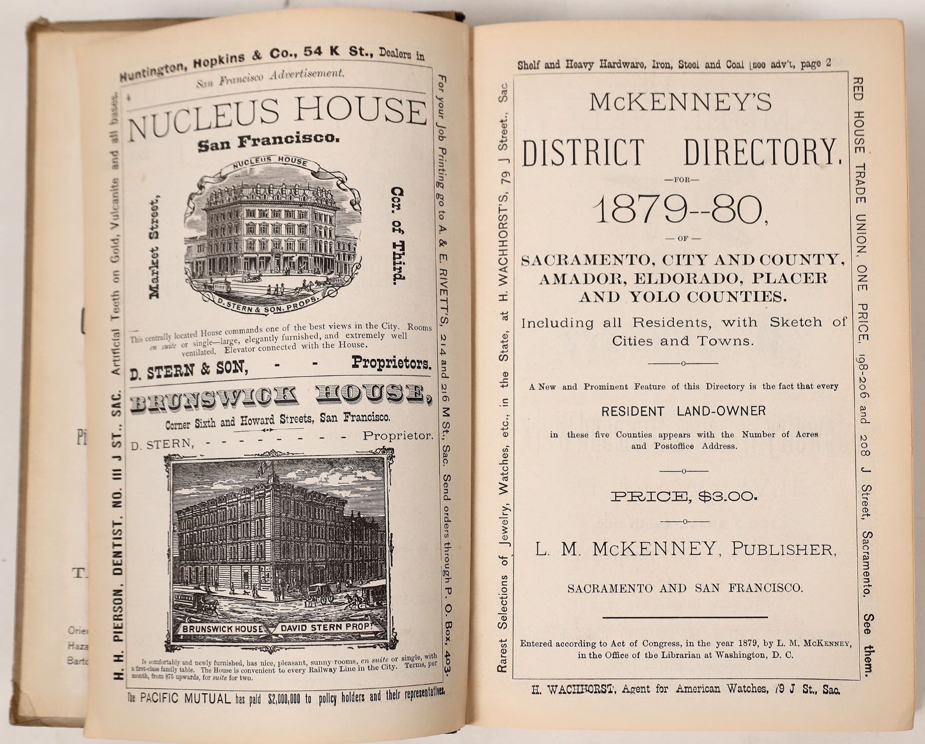 District Directory for 1879-80 of Sacramento, City and County, Amador, El Dorado, Placer and Yolo Counties published by L.M. McKenney. This directory is paginated by county and contains alphabetical lists of residents, their, occupations, and their addresses. Leland Stanford is listed on page 250. Each section begins with a brief overview of the respective county. The title pages states that, "A new and prominent feature of this directory is the fact that every resident land-owner in these five counties appears with the number of acres and post office address." Business advertisements are included throughout. 8.75 x 5.5, very good condition.
