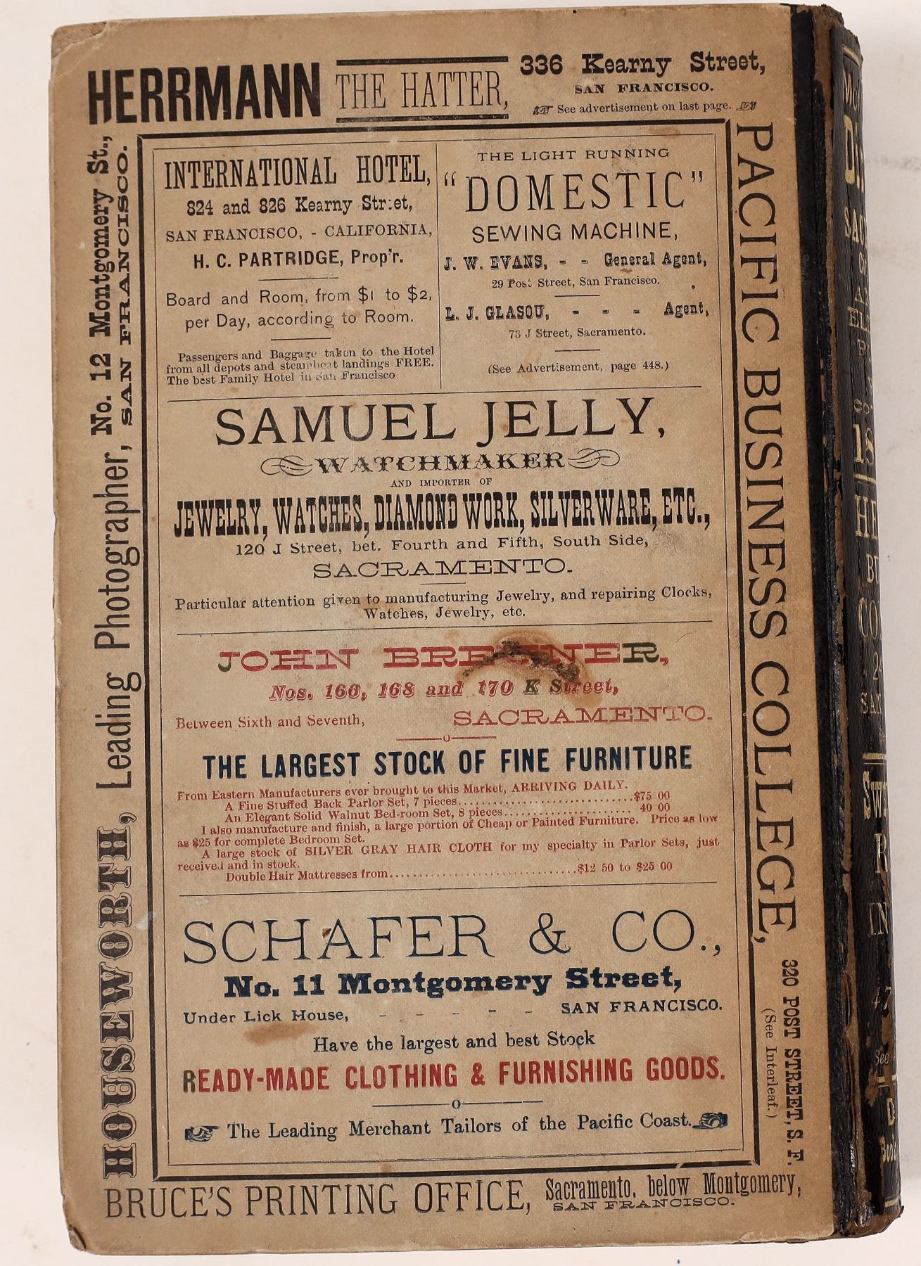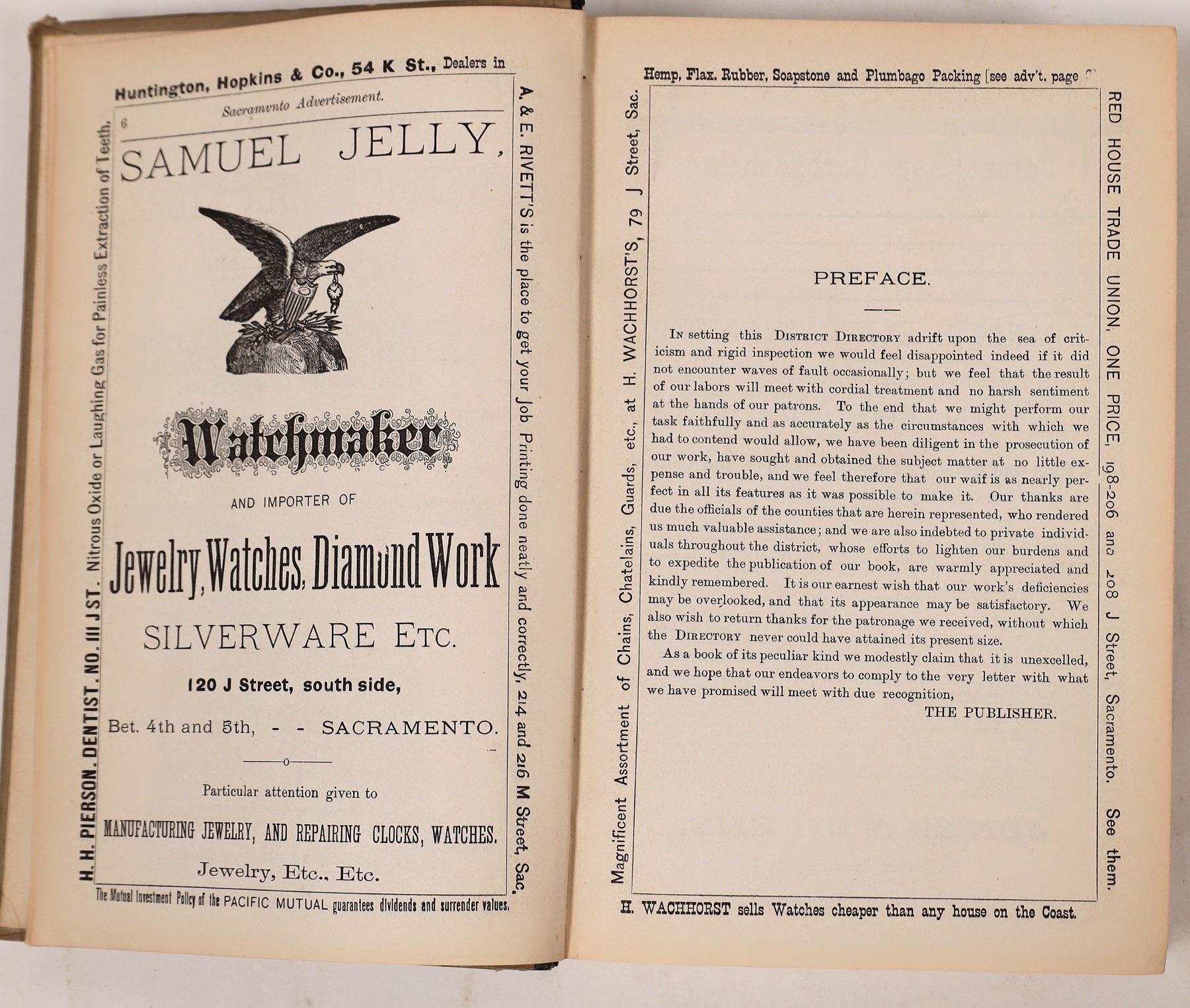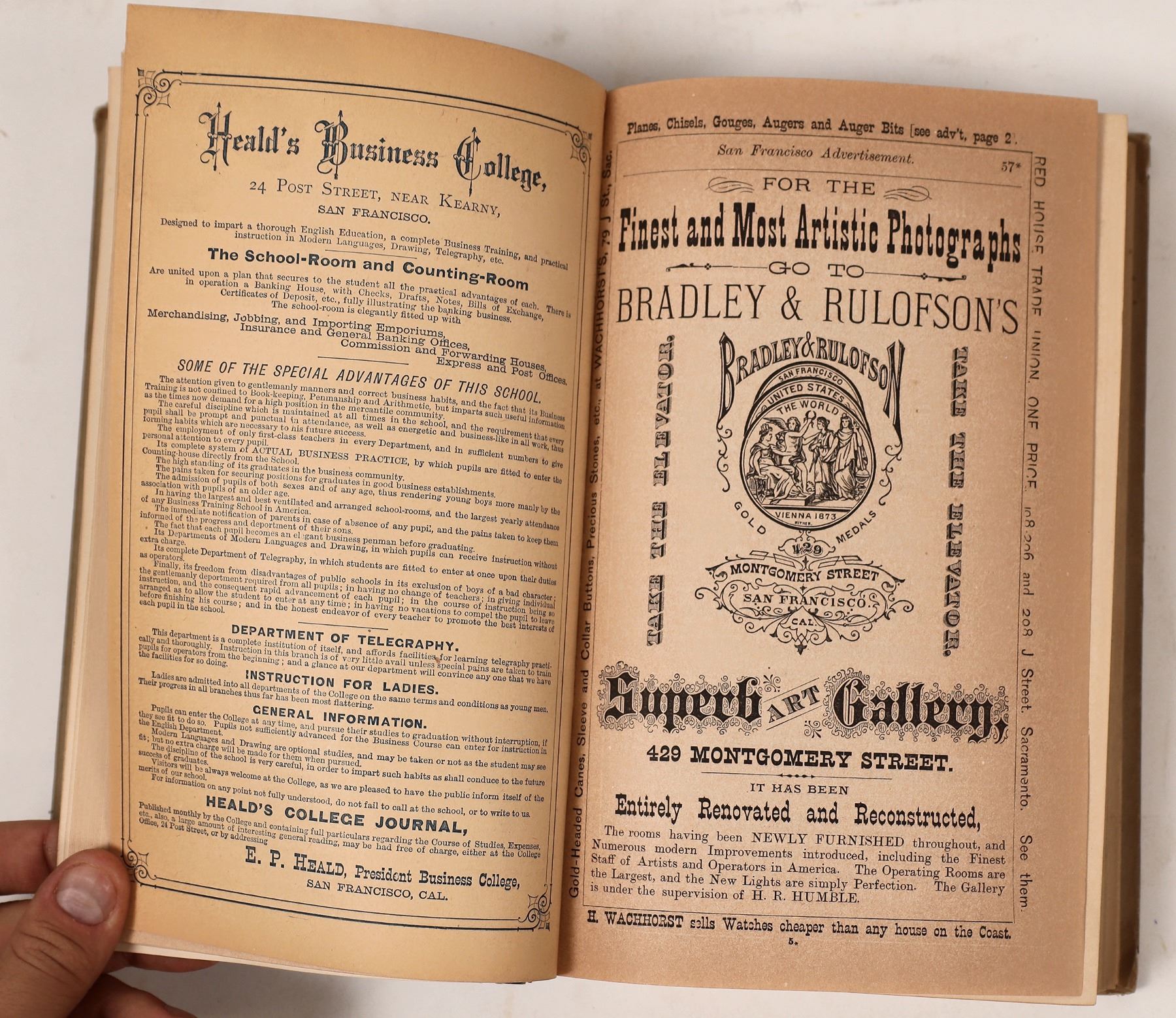 District Directory for 1879-80 of Sacramento, City and County, Amador, El Dorado, Placer and Yolo Counties published by L.M. McKenney. This directory is paginated by county and contains alphabetical lists of residents, their, occupations, and their addresses. Leland Stanford is listed on page 250. Each section begins with a brief overview of the respective county. The title pages states that, "A new and prominent feature of this directory is the fact that every resident land-owner in these five counties appears with the number of acres and post office address." Business advertisements are included throughout. 8.75 x 5.5, very good condition.