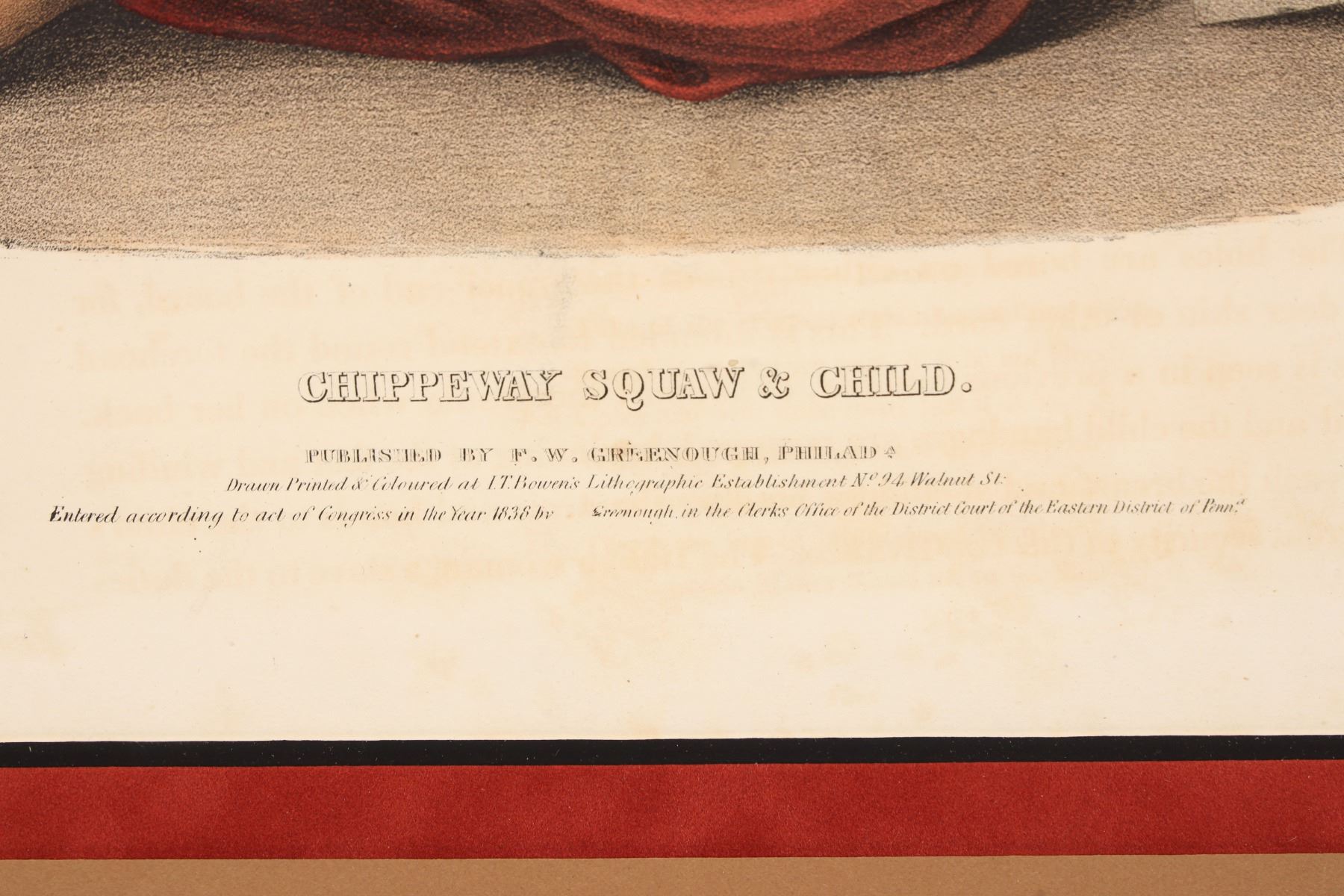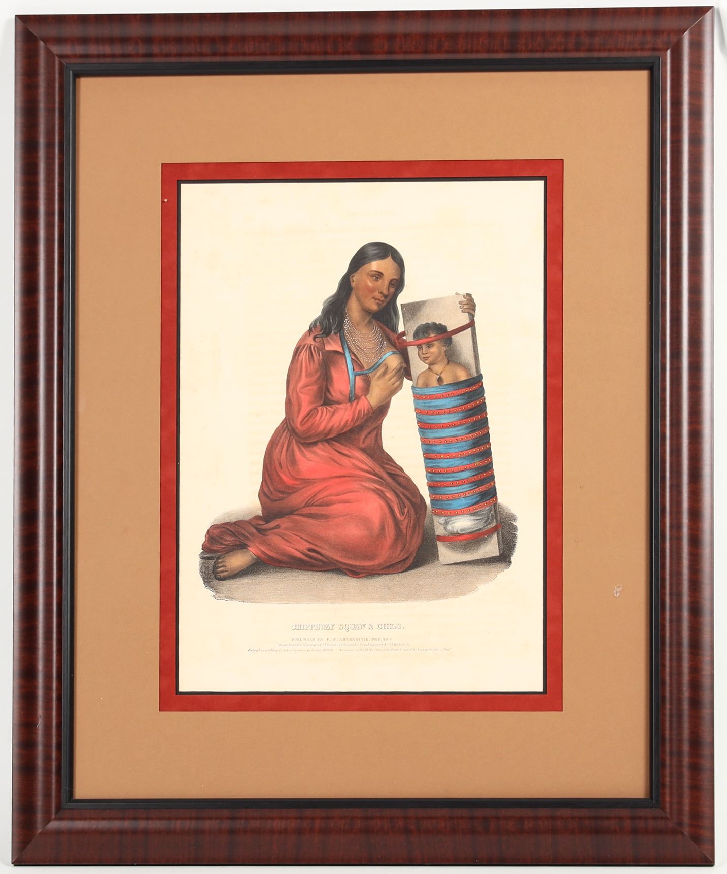 Stunning original folio litho from McKenny & Hall's The History of Indian Tribes in America, dated 1838. This print is one of the original 120 litho folio plates in the work, which is unquestionably the most famous artistic work on American Indians, with complete folios selling for more than $150,000. The piece here is triple matted and framed, overall size 27.5 x 23", print size about 16.5 x 12.5". Excellent condition. The subject, a Chippeway Squaw and child in a cradle board is a masterful rendition of the native tribe from the Chippewa River region of northern Wisconsin, though originally the tribe occupied a massive area around the Great Lakes.