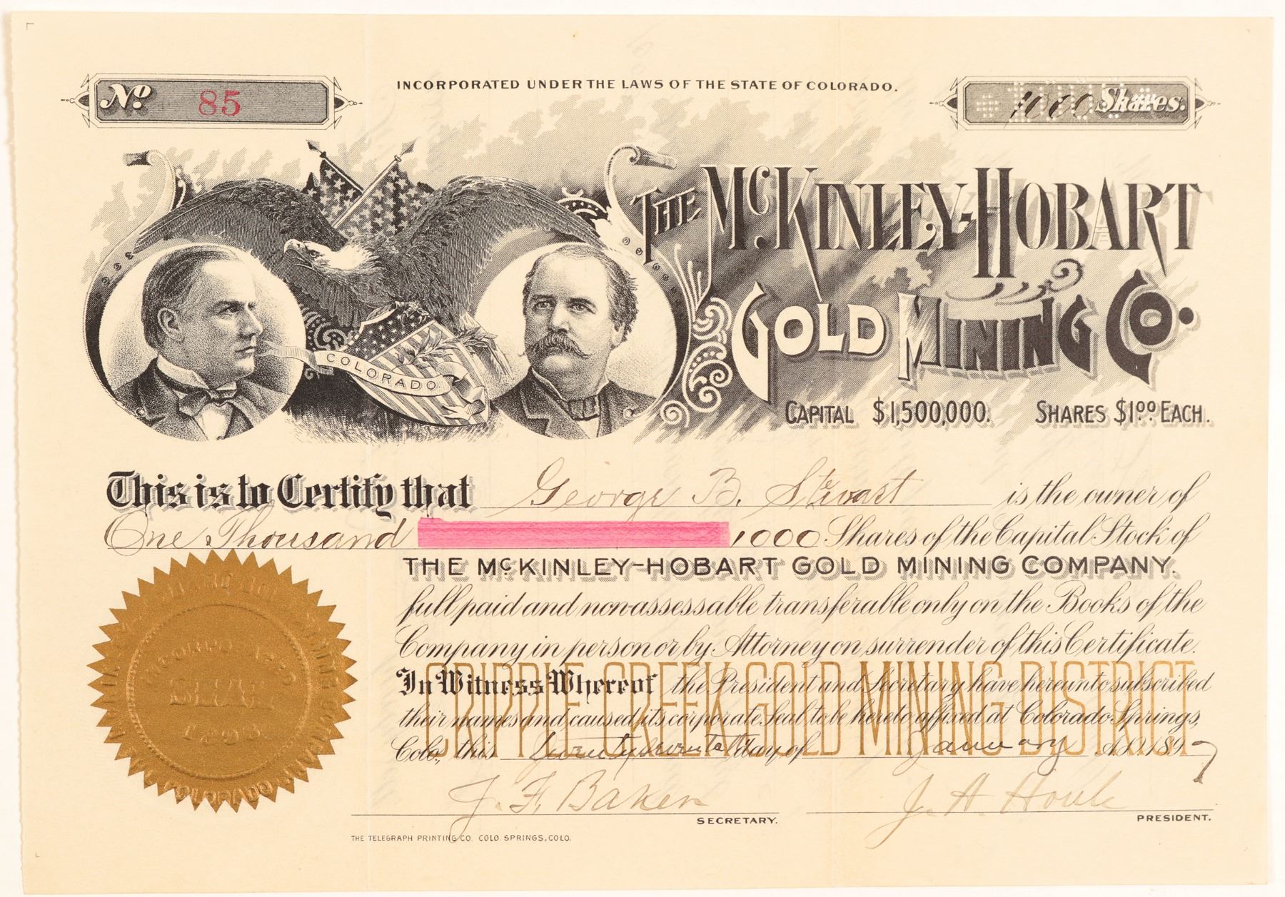 Stock Certificate from the McKinley-Hobart GMC. Incorporated in 1896 in Colorado. Located at Cripple Creek. Certificate number 85 issued in 1897 to George B. Stewart. Signed by president J.A. Houle, and J. F. Baker. Printed by The Telegraph Printing Co. Colo Springs, Colo. Size 3.75 by 6 inches. Not cancelled. Excellent condition. Vignette of President McKinley and Vice President Hobart. Cripple Creek (very fancy). Adhesive gold seal. Not in Hollister, Corbett, Fossett, etc.