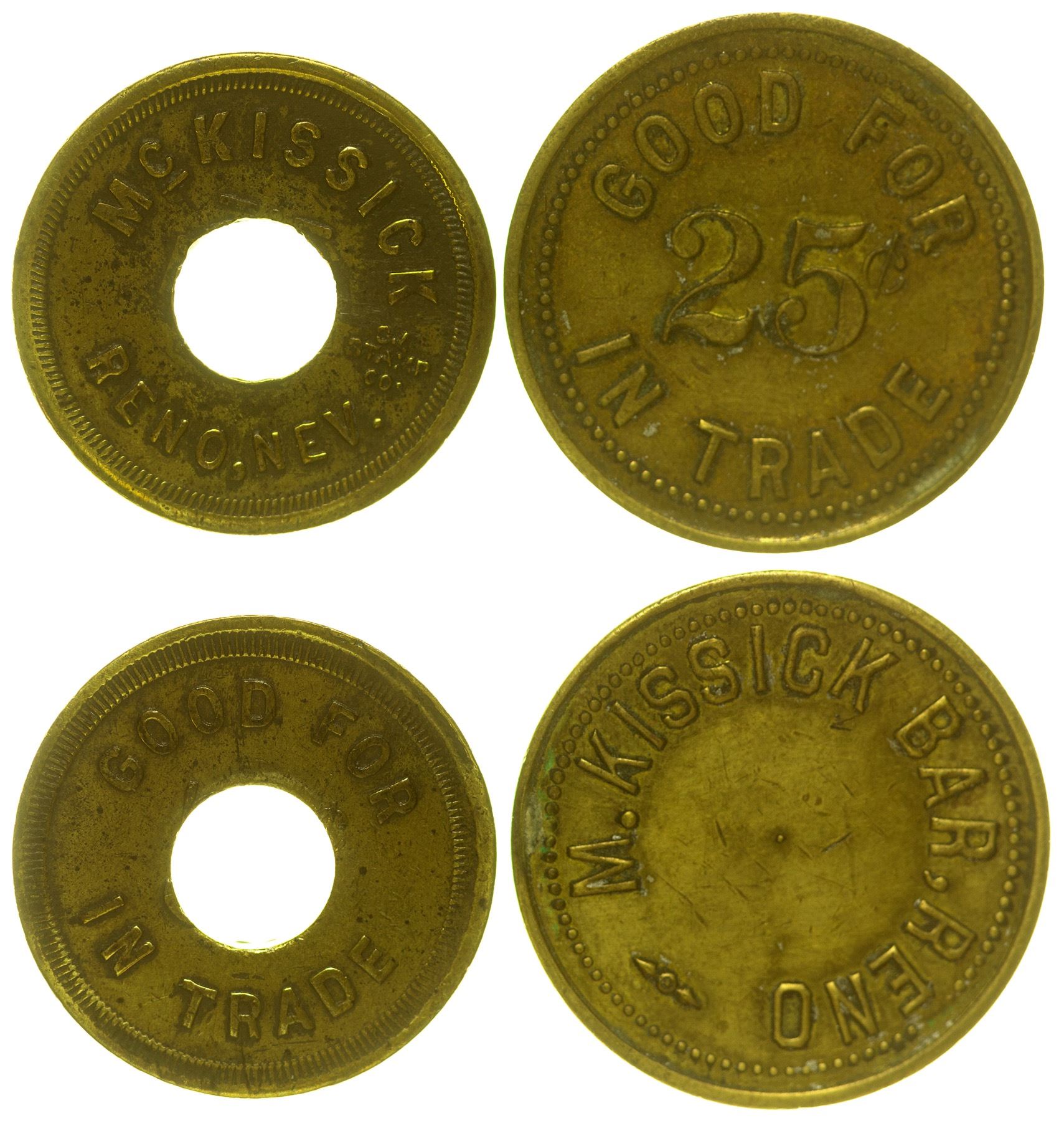 1) McKissick Bar / Reno // GF 25c IT. 2) McKissick / Reno, Nev // GF [5c] IT. Center hole punched. State: Nevada City: Reno HWAC#: 46983 Date: c1908