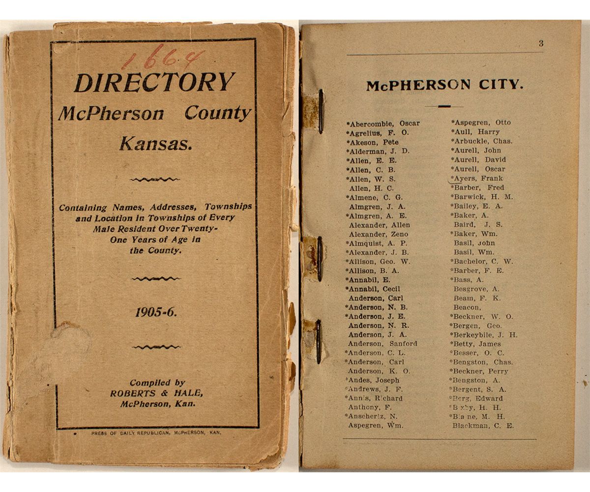 Directory McPherson County Kansas--Containing Names, Addresses, Townships and Location in Townships of Every Male Resident Over Twenty-one Years of Age in the County. 1905-6. Compiled by Roberts & Hale, McPherson, Kan. Press of Daily Republican, McPherson, Kan. 184 pages. Includes foldout map of county. Condition: toning. Tears to some pages and front cover. Piece missing from back cover. Rarity: [i]City: County: State: KSDate:
