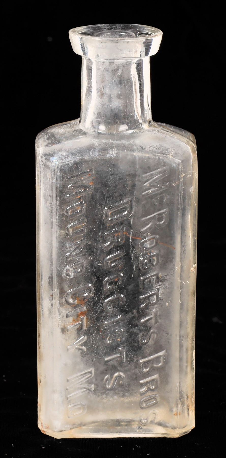 Clear embossed McRoberts Bros./Mound City, Mo. 4.25". Internal base chip. No other apparent chips or cracks. Missouri Mound City Gary Bracken Collection