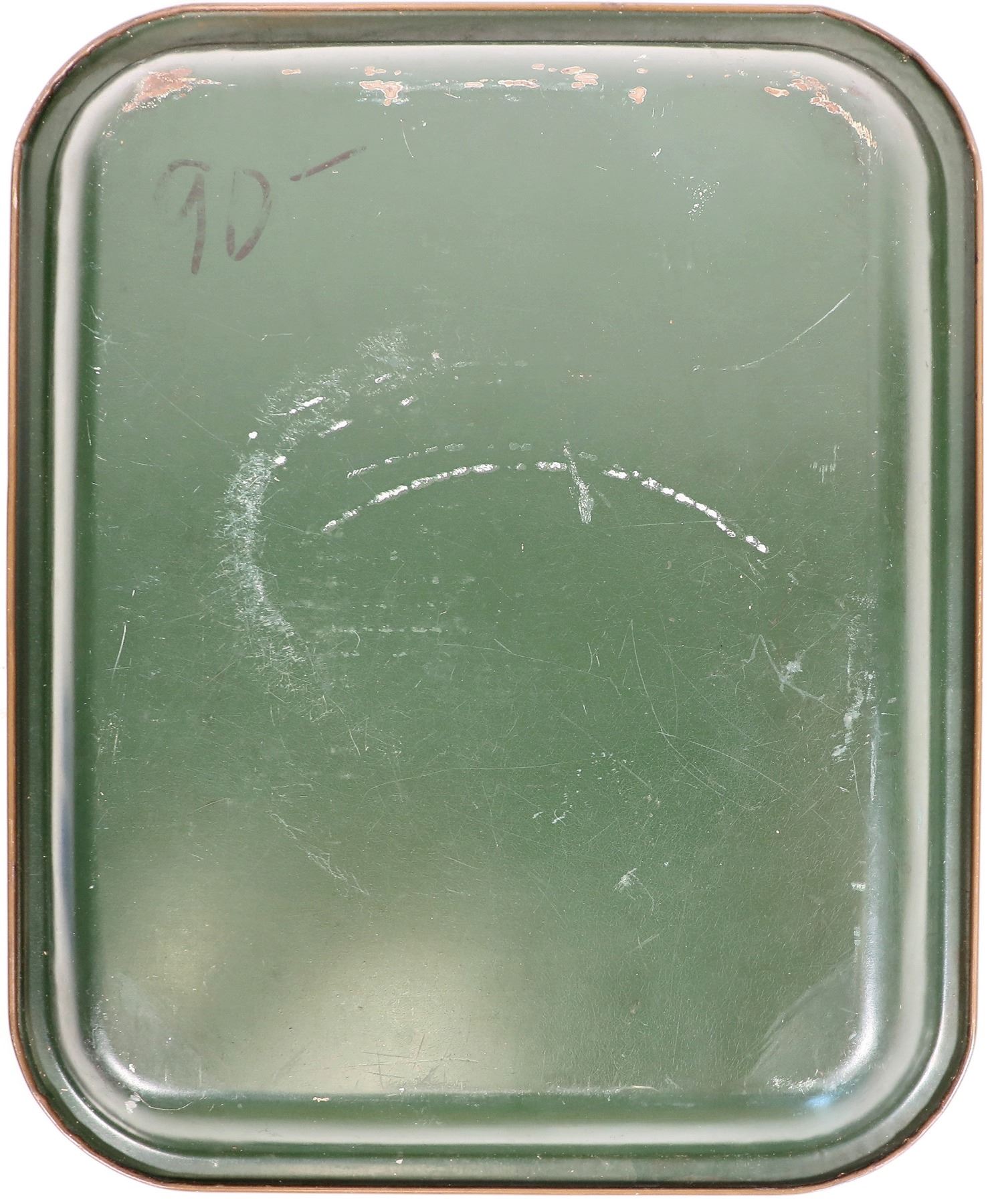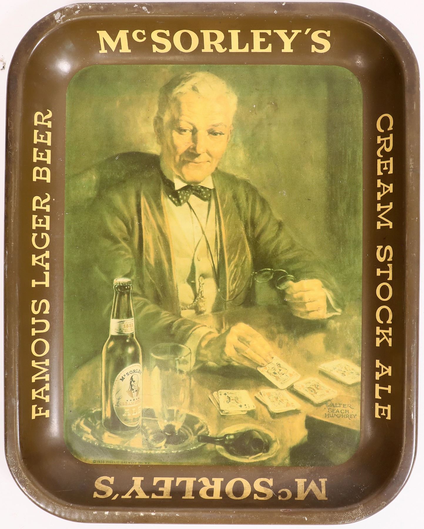 This McSorley's beer tray meaurses 10.5 in. X 13.5 in. with an image of a gentleman playing cards by himself and enjoying his McSorley's bottled ale. Marked "McSorley's Cream Stock Ale/ Famous Lager Beer". The oldest brewery in New York. C. 1940's . Minor scratches on the edge, clear image base. Image is by Walter Beach Humphrey. New York City New York c.1940s