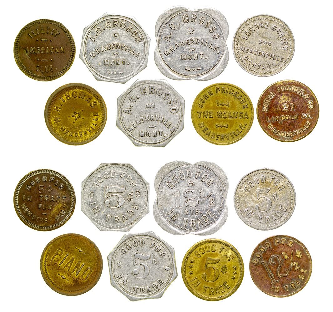 Lot of 8: Italian American Club, W.H. Thomas (piano on reverse), A.G. Grosso (scalopped and 2 octogonal), Lorenz Crnich, John Prideaux/ The Colusa, and Peter Funduk & Co. City: Meaderville State: Montana Date: ID: 36537