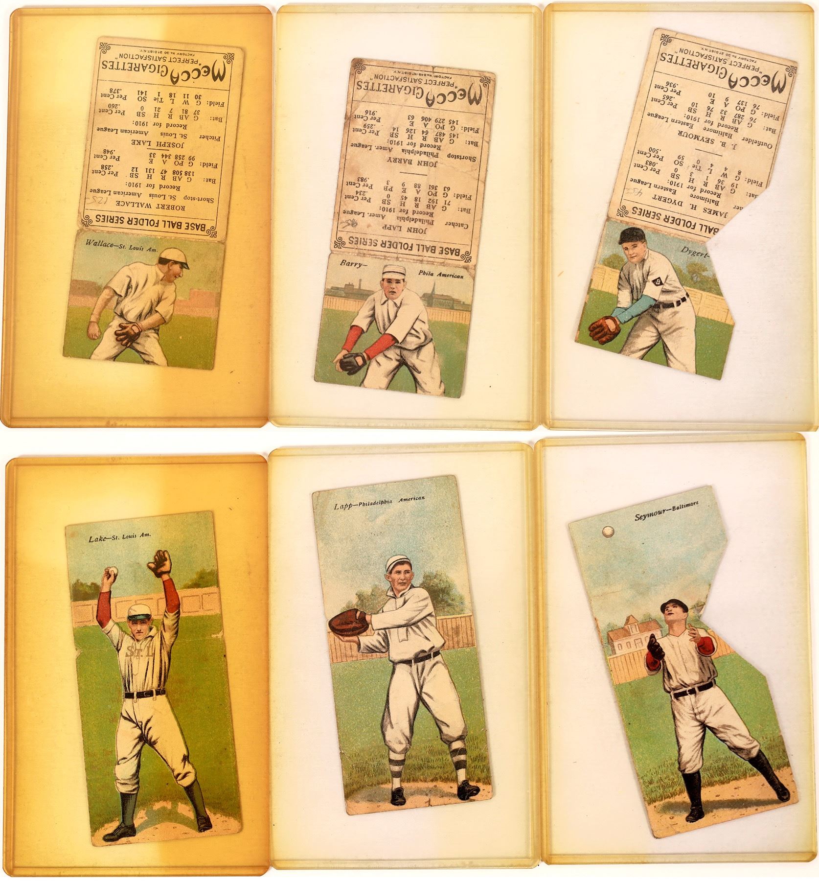 Three rare Mecca Cigarettes baseball cards. Cards feature Robert Wallace of the St. Louis Browns, James Dygert of Baltimore in the Eastern League and John Lapp of the Philadelphia Athletics. The 1911 T201 Mecca Double Folders Baseball cards were inserted into packages of Mecca Cigarettes. A total of 50 cards and 100 players make up a complete set. There is a notch cut from one of the cards. I'm a baseball fan and I've never seen these before.