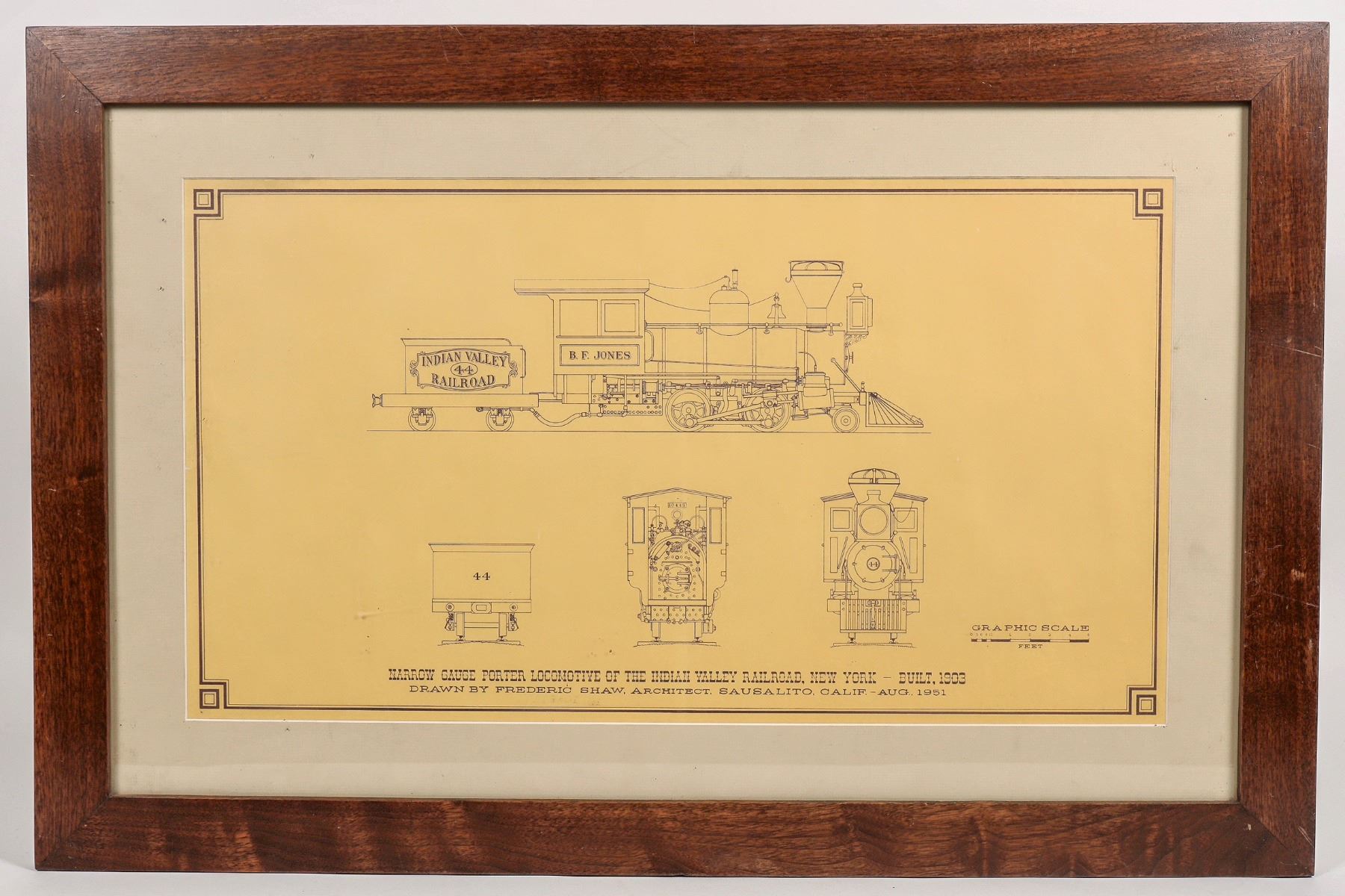 A mechanical drawing of an Narrow Gauge Porter Locomotive built in 1903 and used on The Indian Valley railroad in New York by Frederic Shaw of Sausalito. The matted and framed piece measures 22"x 33"and is in excellent condition. Please see photos for more details.