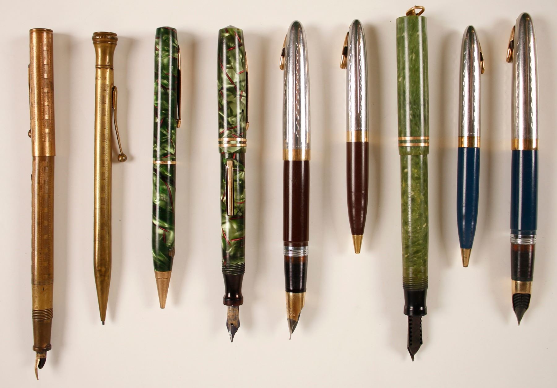 9 pens and pencils. Cased brass Nupoint set, Sheaffer Flat Top white dot lifetime lever filler, Sheaffer Touchdown pen and pencil set, Sheaffer Touchdown sentinal deluxe tuckaway pen and pencil, Weidlich green pen and pencil City: State: Date: HWAC# 80150