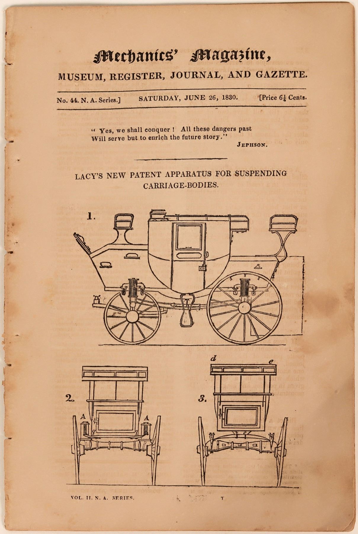 Mechanics Magazine, Museum, Register, Journal, and Gazette, No. 44 N. A. Series, Saturday June 26, 1830. Includes a discussion or Lacy's New Patent Apparatus for Suspending Carriage-Bodies, and an article for The Exercise for Perpetual-Motion Seekers. Starting on page 274 through page 288. Size is 5-1/2 x 8-3/8 inches. Appears to have been taken from a bound volume. See photo for condition and content details.