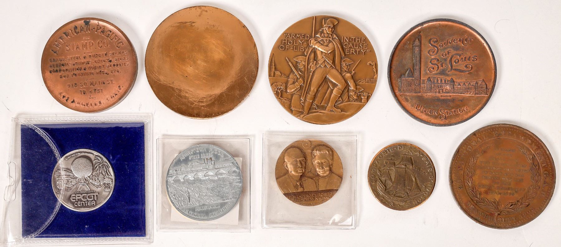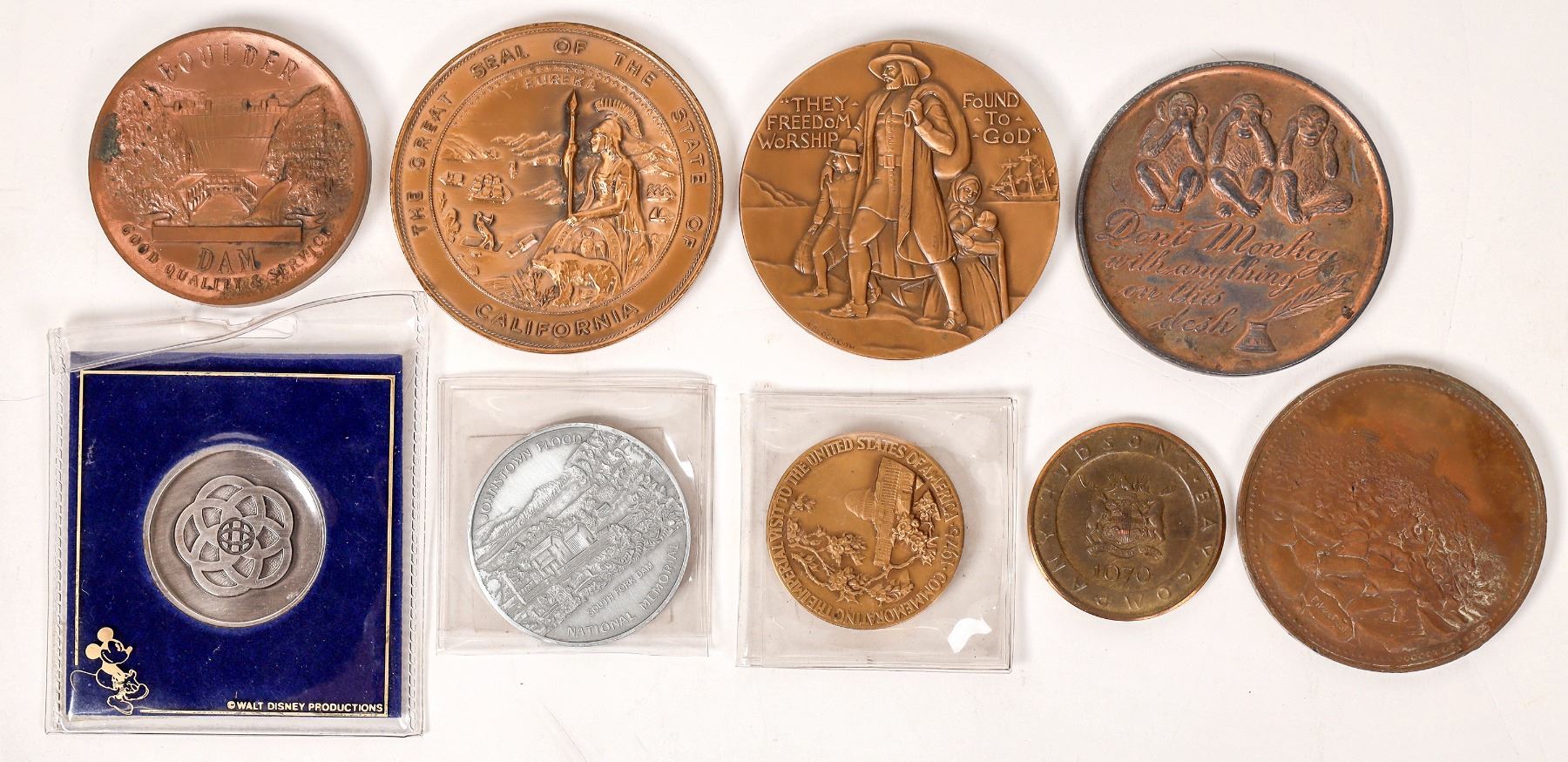 Lot of nine different medals: 1) Souvenir of St. Louis Union Station; bronze,72 mm. 2) Hudson's Bay Company; bronze,45 mm. 3) Johnston Flood National Memorial; white metal, 50 mm. 4) 39th National Encampment of the G. A. R. Denver, Sept. 1905; bronze, 70 mm. 5) Epcot Center, white metal, 40 mm. 6) The Great Seal of the State of California, bronze, 75 mm. 7) Boulder Dam, brass, 63 mm. 8) Emperor Hirohito/Empress Nagako visit to the U.S. 1975; bronze, 45 mm. 9) Society of Medalists 63rd Issue May 1961 "They Found Freedom to Worship God"; bronze, 73 mm.