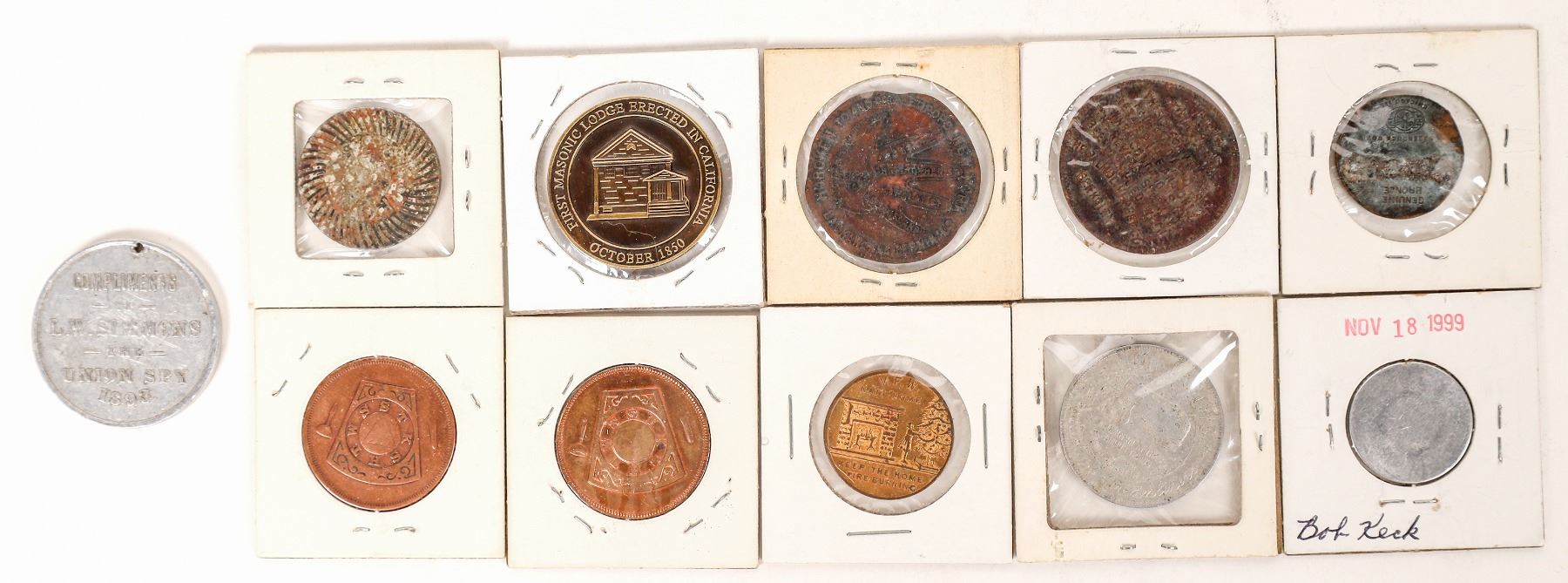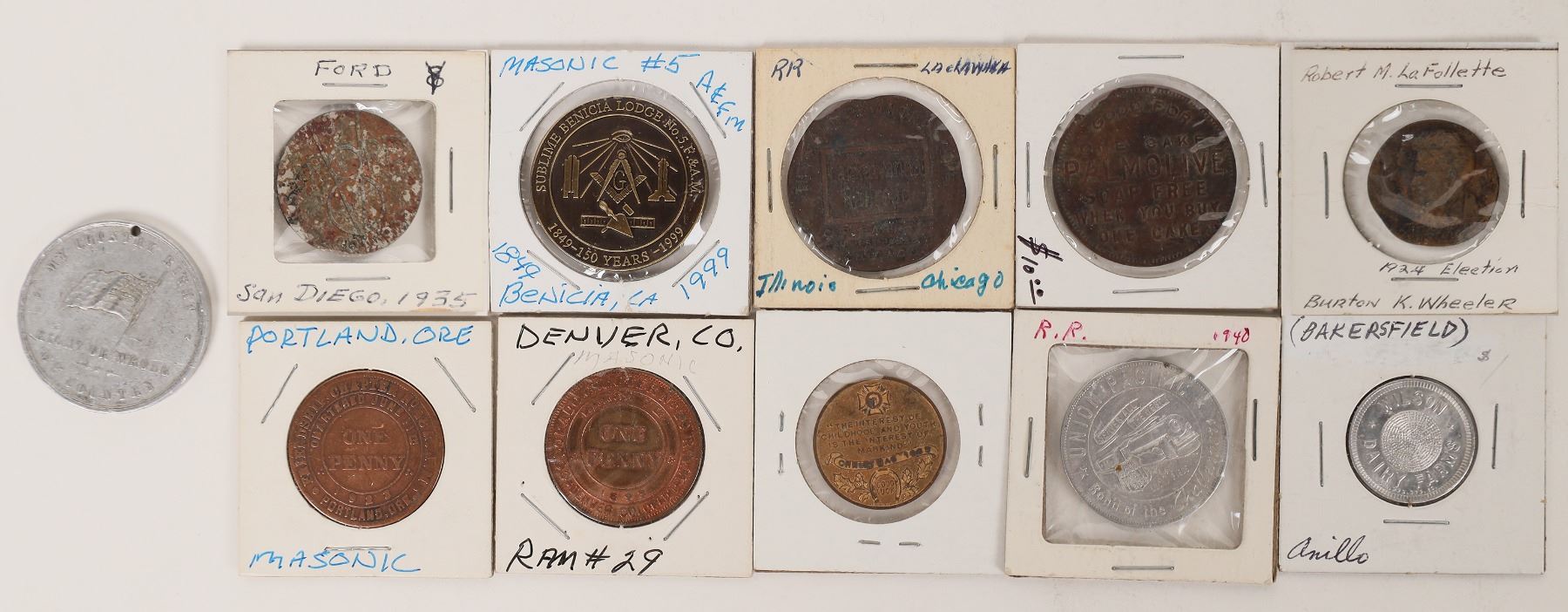 Lot of 12 miscellaneous medals: Lackawanna Railroad; 1893 L. W. Simmons The Union Spy; 1935 Ford San Diego; 1999 Benicia Masonic Lodge; 1924 Robert M. LaFollette; Palmolive Soap; Gensler Lee Diamonds; Wilson Dairy Farms Bakersfield; Portland Oregon Masonic Penny; V.F.W. National Home; Denver Colorado Masonic Penny; 1940 Union Pacific.