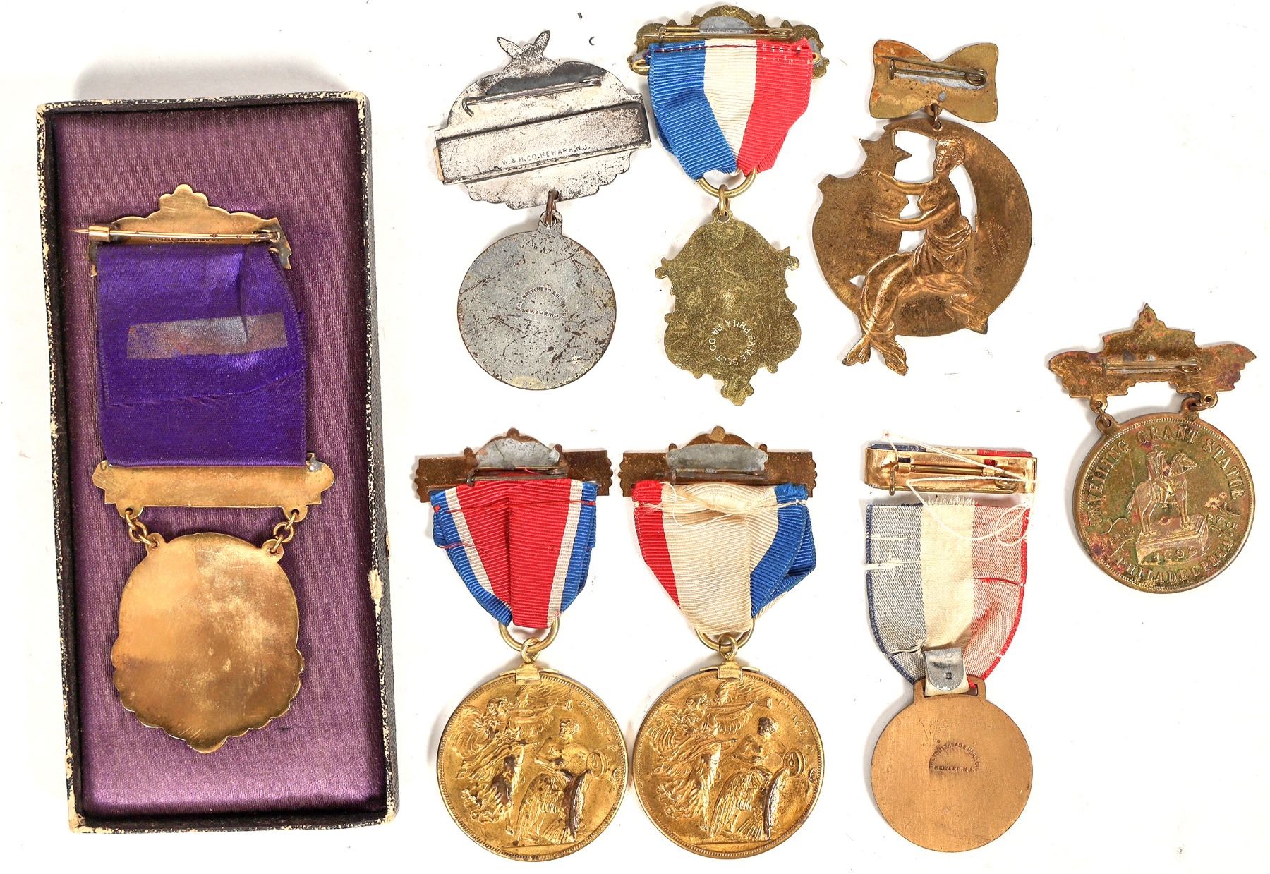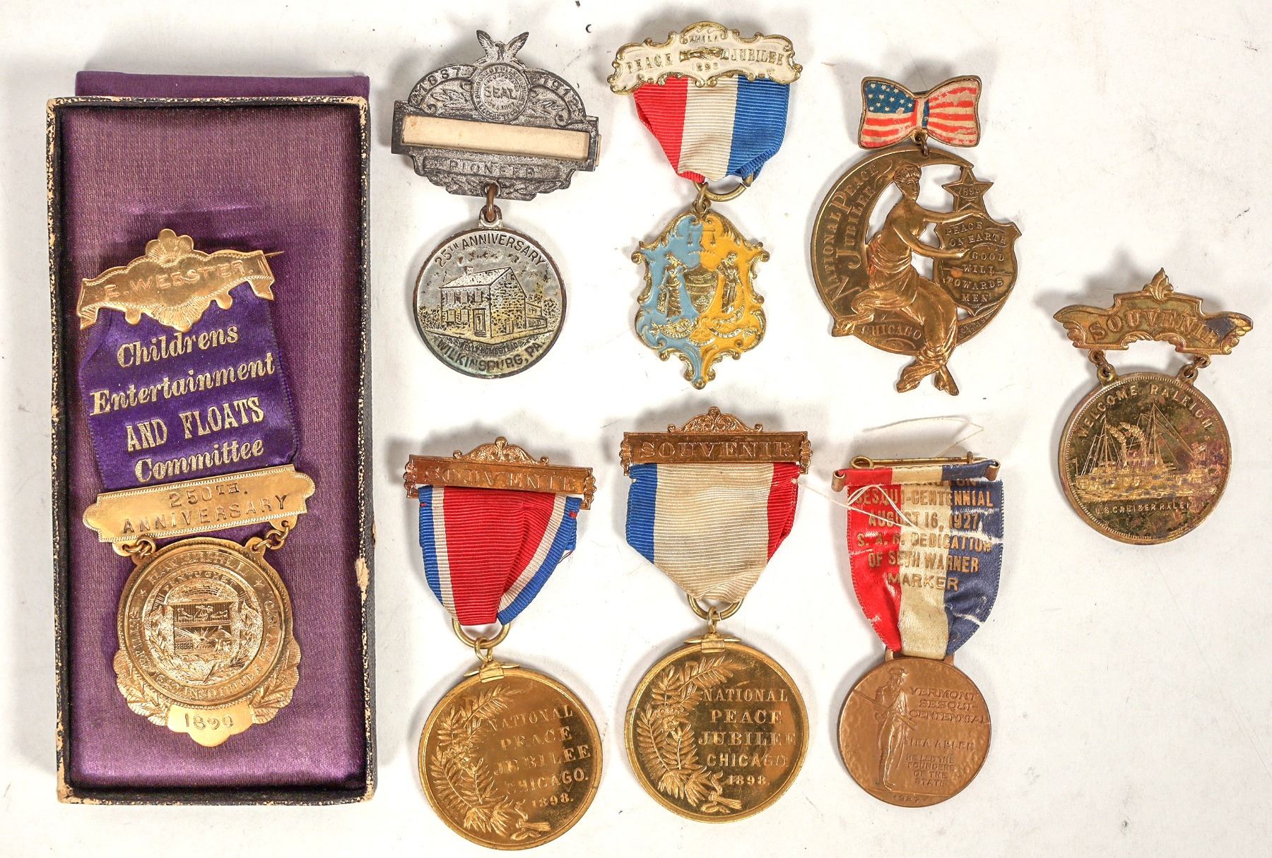 Eight vintage pinback medals: 1) 1890 Children's Entertainment and floats committee (35 mm); 2) 1912 25th Anniversary Wilkinsburg, PA Pioneer (31 mm); 3) 1898 National Peace Jubilee Chicago (38 mm); 4) 1898 Philadelphia Peace Jubilee (26 mm); 5) 1898 National Peace Jubilee Chicago (44 mm); 6) 1898 National Peace Jubilee Chicago (26 mm). 7) 1927 Vermont Sesquicentennial (31 mm); 8) 1899 Unveiling Grant Statue Philadelphia.