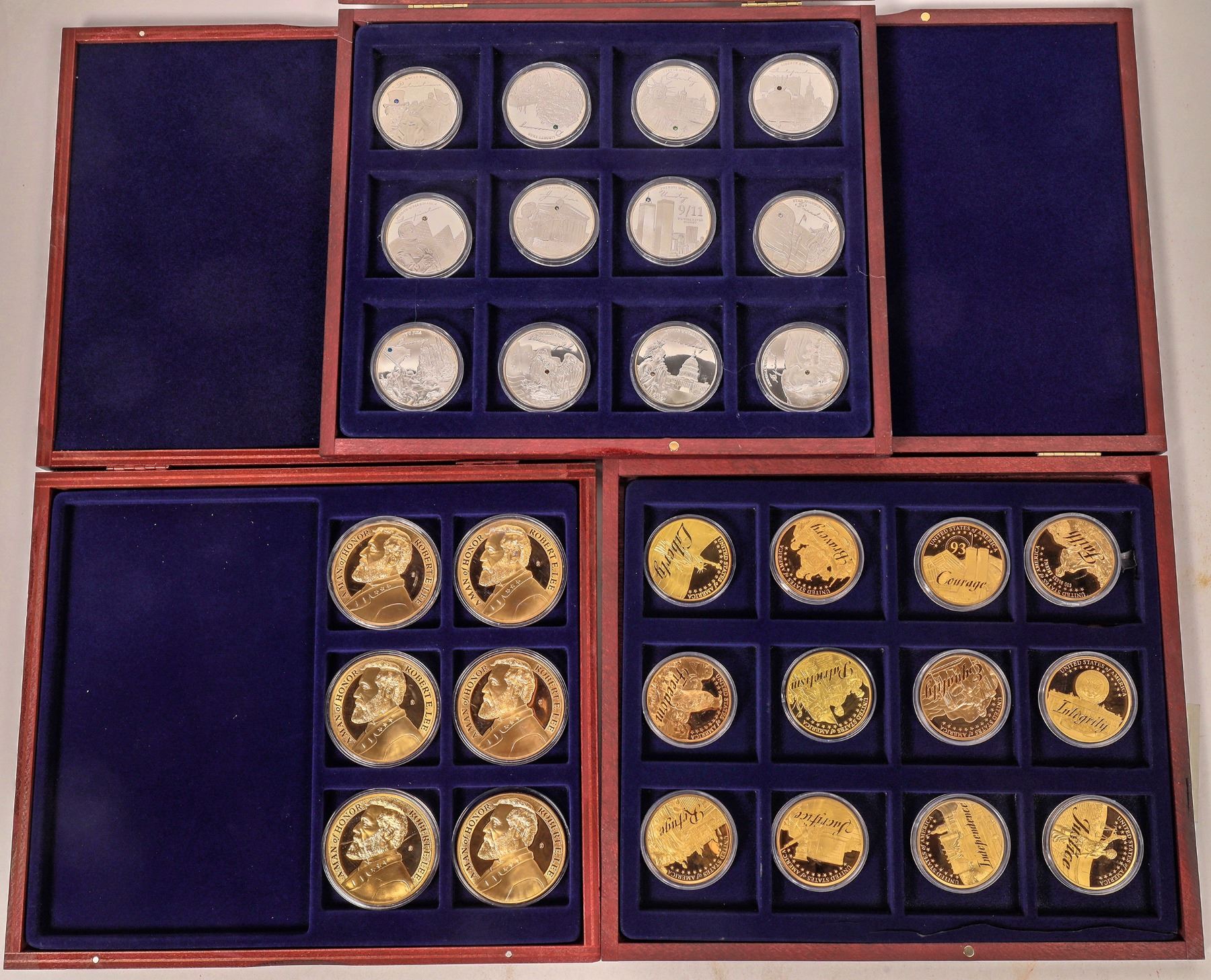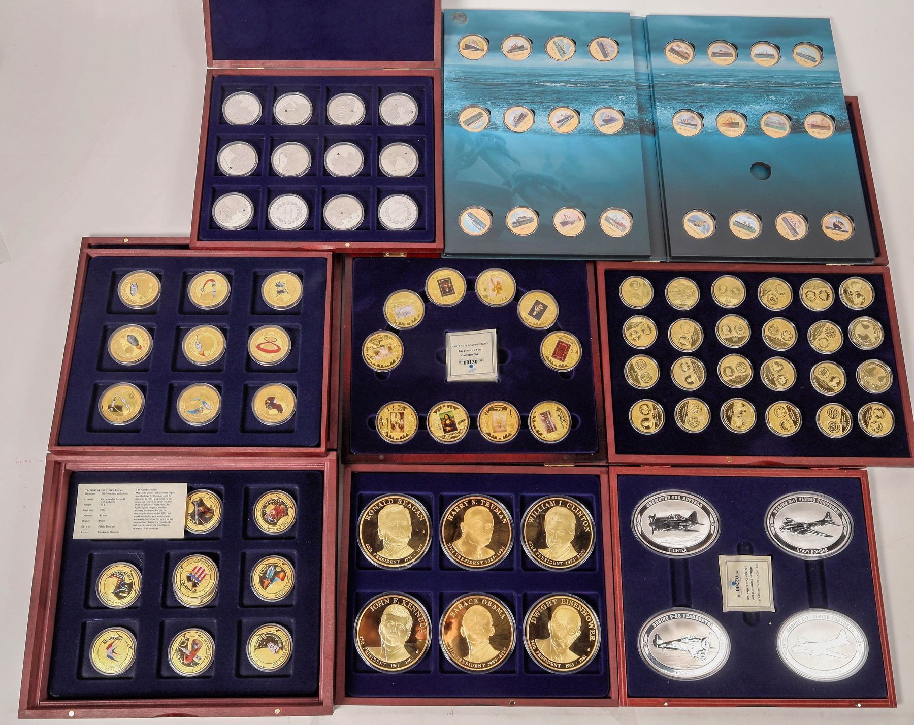 Dealer lot of medal collections in wooden cases: 1) Presidential Dollar Trials by American Mint: six 70 mm, copper layered in gold medals. 2) Famous Ships of the World Complete Set by American Mint; 24 copper layered in gold medals with padprint, featuring famous boats. 3) Leonardo da Vinci Complete Set by American Mint; ten 40 mm, copper layered in gold with color padprint medals. 4) Military Planes of Pearl Harbor Coin Collection by American Mint; four silver plated copper planchets, oval 85 mm x 62 mm.: B-17 Flying Fortress, P-26 Peashooter, Brewster F2A Buffalo. 5) Most Expensive Coins in the World by American Mint; 24 copper layered in gold coins, 33 mm, paying homage to numismatic rarities such as the 1933 Double Eagle, the 1794 Flowing Hair dollar and many more from around the world. 6) The Apollo Missions Complete Set by American Mint; 18 medals, copper layered in gold with pad print, 40 mm each. 7) American Symbols of Freedom Complete Set by American Mint; twelve copper medals layered in gold, 40 mm. 8) Robert E. Lee - A Man of Honor Complete Set by American Mint; six 50 mm medals of copper layered in gold. 9) Symbols of Freedom Complete Set by American Mint; twelve copper medals silver-plated with Swarovski crystal, each 40 mm. 10) Symbols of Freedom Complete Set by American Mint; twelve 40 mm copper medals silver-plated with Swarovski crystal.