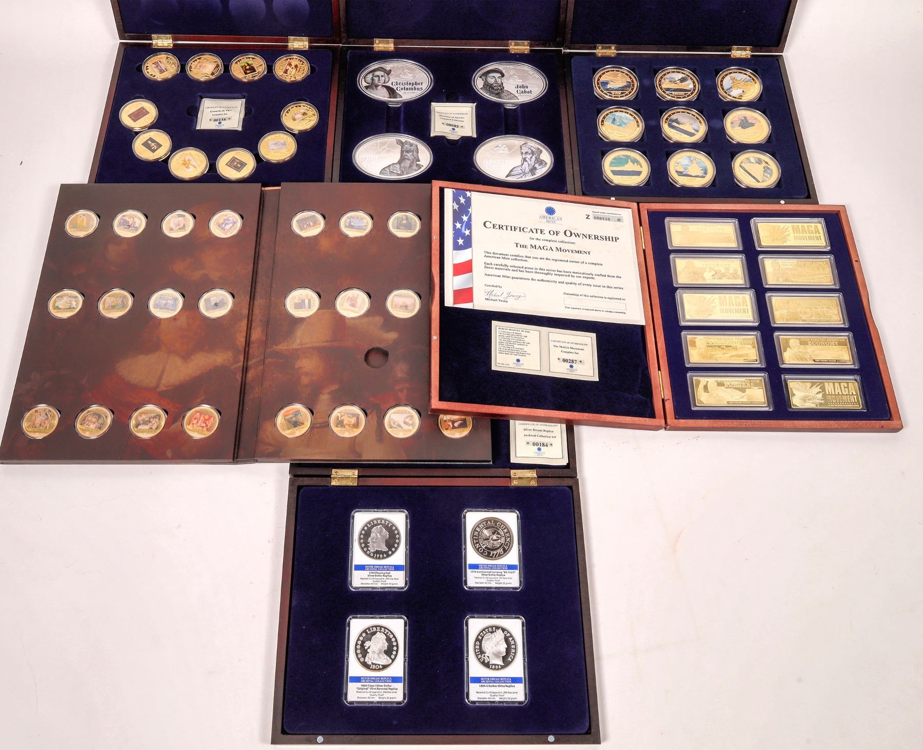 Dealer lot of 10 wooden cases (11 x 9 inches) with medals: 1) Discovery of America; issued by American Mint: four oval medals 85 x 62 mm, copper, silver-plated with pad-print: featuring John Cabot, Amerigo Vespucci, Leif Erikson and Christopher Columbus. 2) Leonardo da Vinci Complete Set, issued by American Mint; ten 40 mm medals, copper, layered in gold with color pad-print. 3) The World's Most Famous Paintings; 24 medals, 32 mm, with colorized versions of famous paintings. 4) Silver Dream Replica Archival Collection Set; issued by American Mint, four silver-plated copper medals, 40 mm, replicating famous coins. 5) Most Famous Battleships Complete Set; by American Mint ; nine 50 mm medals of copper, layered in gold with pad-print of famous battleships.6) Donald Trump Banknote Tributes Collection; by American Mint; twelve 50 mm medals, copper layered in gold with pad-print, an artists' rendering of what U. S. money would look like with President Trump on the bills. 7) Greatest 2nd Amendment Presidents 10-coin set; by American Mint; ten 33 mm medals copper, layered in gold with pad print, the right to bear arms against the Federal Government. 8) Presidential Silver Dollar Trial Set by American Mint; six 40 mm, silver-plated copper medals featuring various presidents. 9) Charters of Freedom by American mint; four 70 mm medals, copper, layered in gold, commemorating the cornerstones of American democracy. 10) The MAGA Movement Complete Set: by American Mint; ten 30 x 70 mm medals, copper, layered in gold explaining Trump's platform.