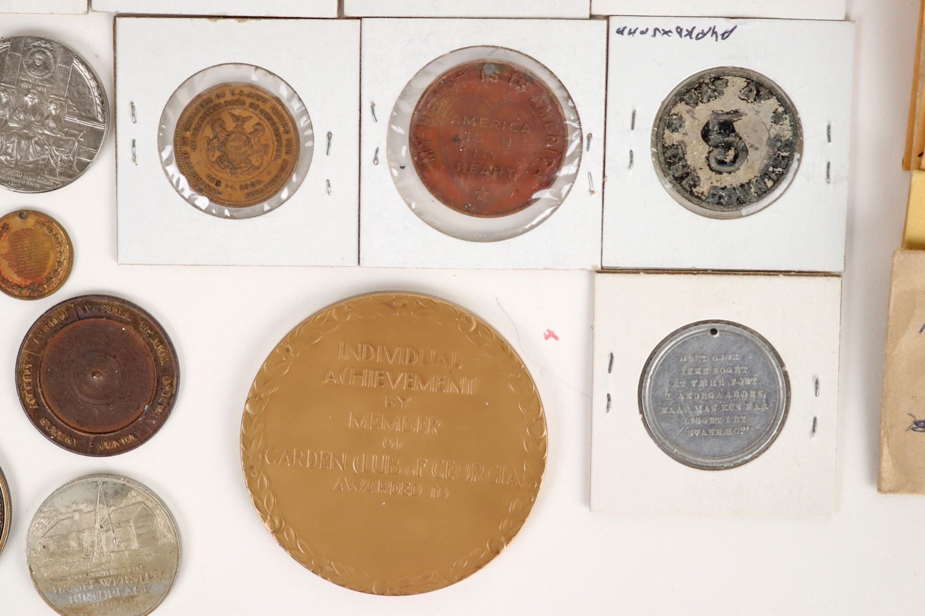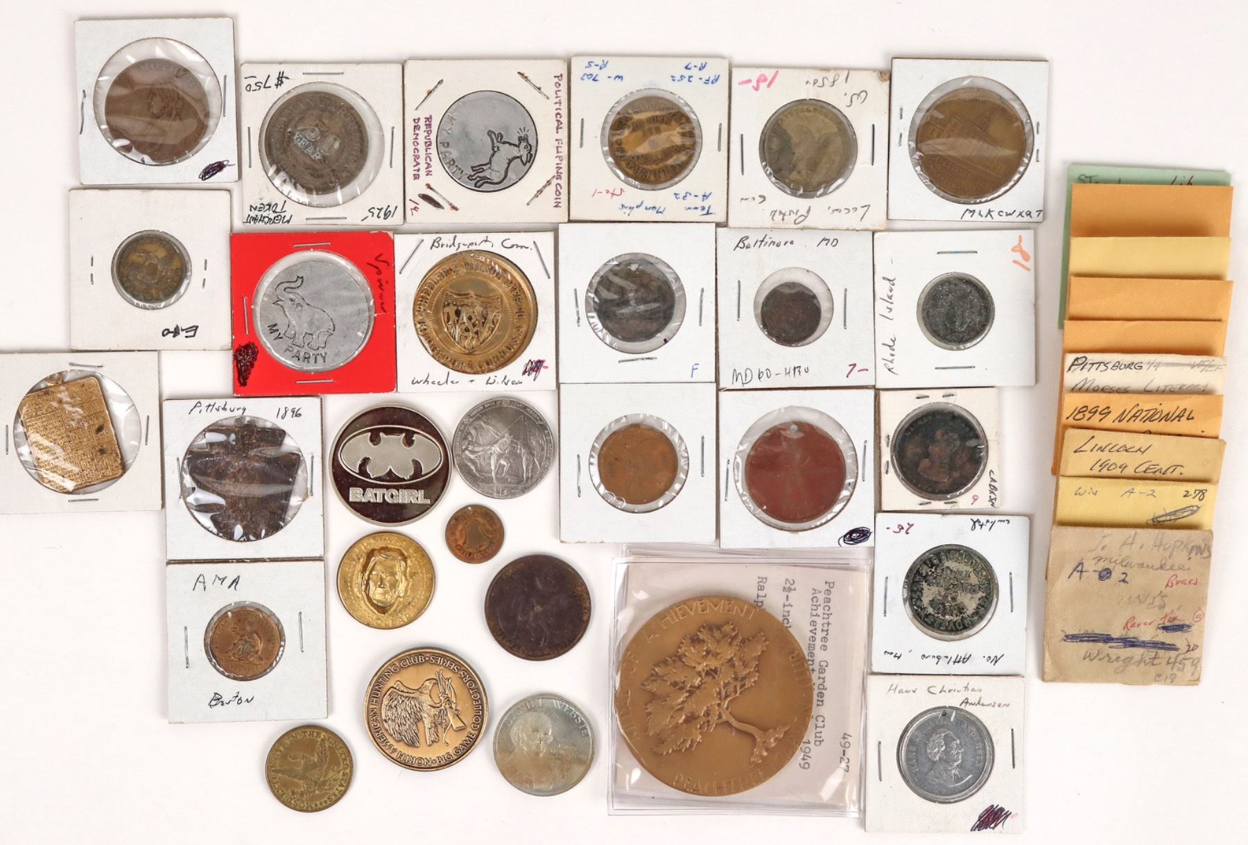Grab bag of 40 American medals: 1925 Lexington KY (3); 1935 Pony Express Diamond Jubilee; 1932 Daniel Webster; Batgirl; 1988 half dollar Reagan head pop out; political flipping coins; North American Hunting Club; 1899 National Junior Republic; Peachtree Garden Club; Hans Christian Anderson and many more. [