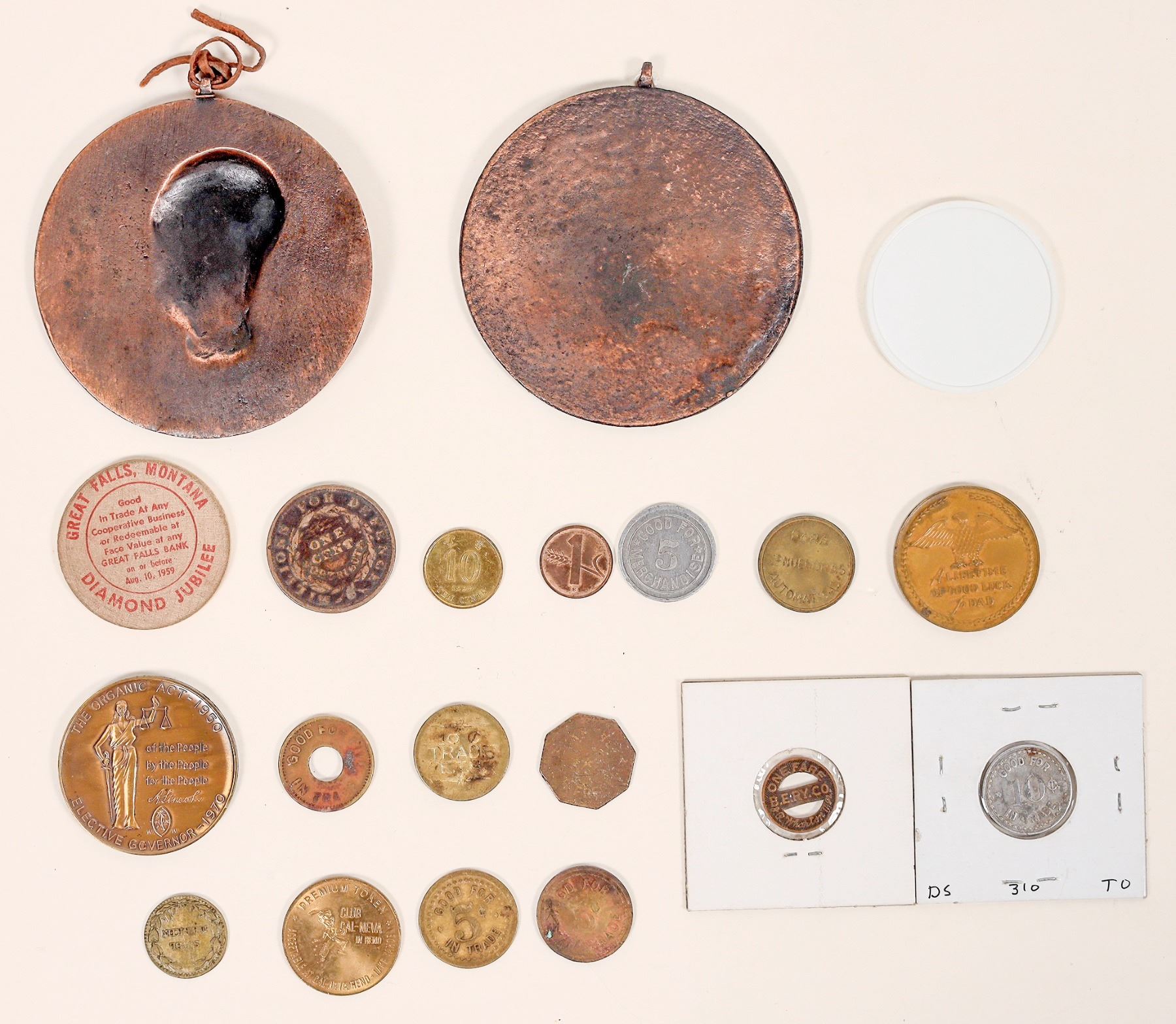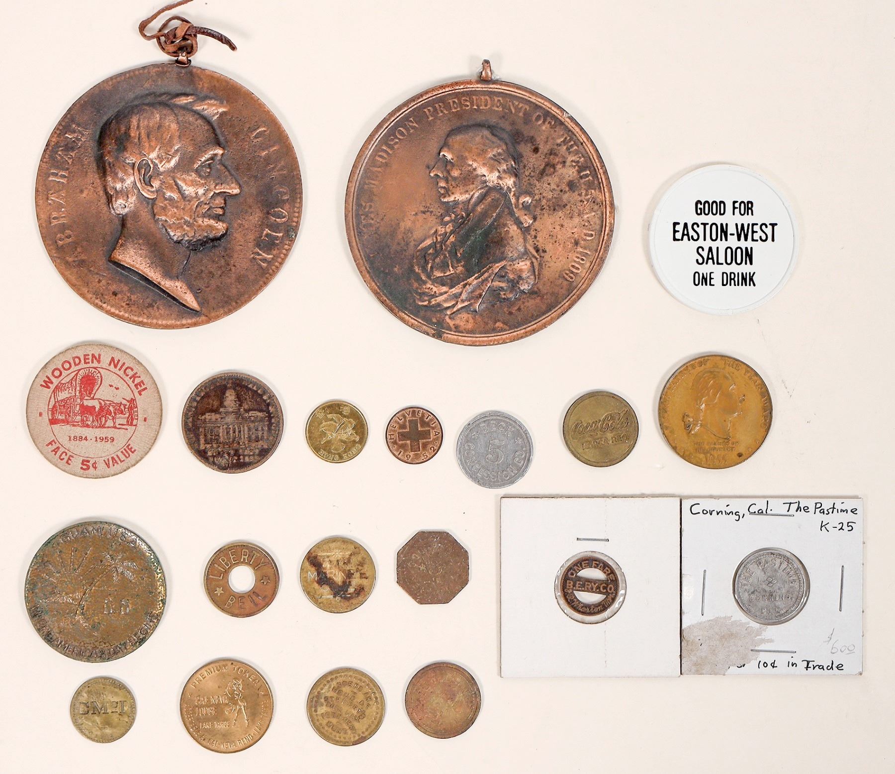 Miscellaneous group: two facsimile peace medals: Lincoln and James Madison (75 mm); Great Falls Montana wooden nickel; B. E. Railway transportation token; token from The Pastime, Corning, CA; Salt Lake City token; Sterret's Pool Hall, Townsend, Montana token; 1970 Guam medal; Easton-West Saloon drink toke; counter stamped spiel marke; M. Merke, Freeland, PA token; Cal Neva Lodge Lake Tahoe token, and more!