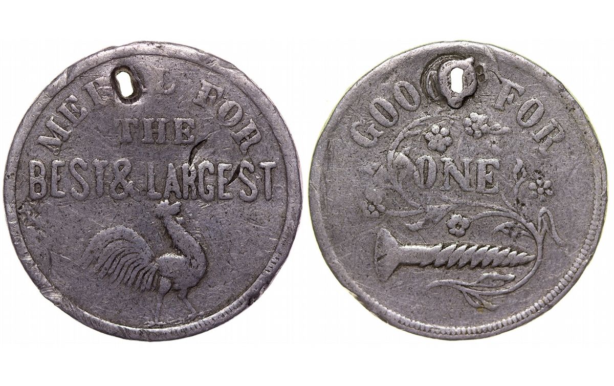 Unique bawdy token, not advertising the brothel, but awarding its customers. Obverse: Good for one [picture of a screw]. Punched. We have been told that a punched medal means that it had been awarded to a 'special' customer! (Contact us if you need a definition of a rooster!City: County: State: Date: