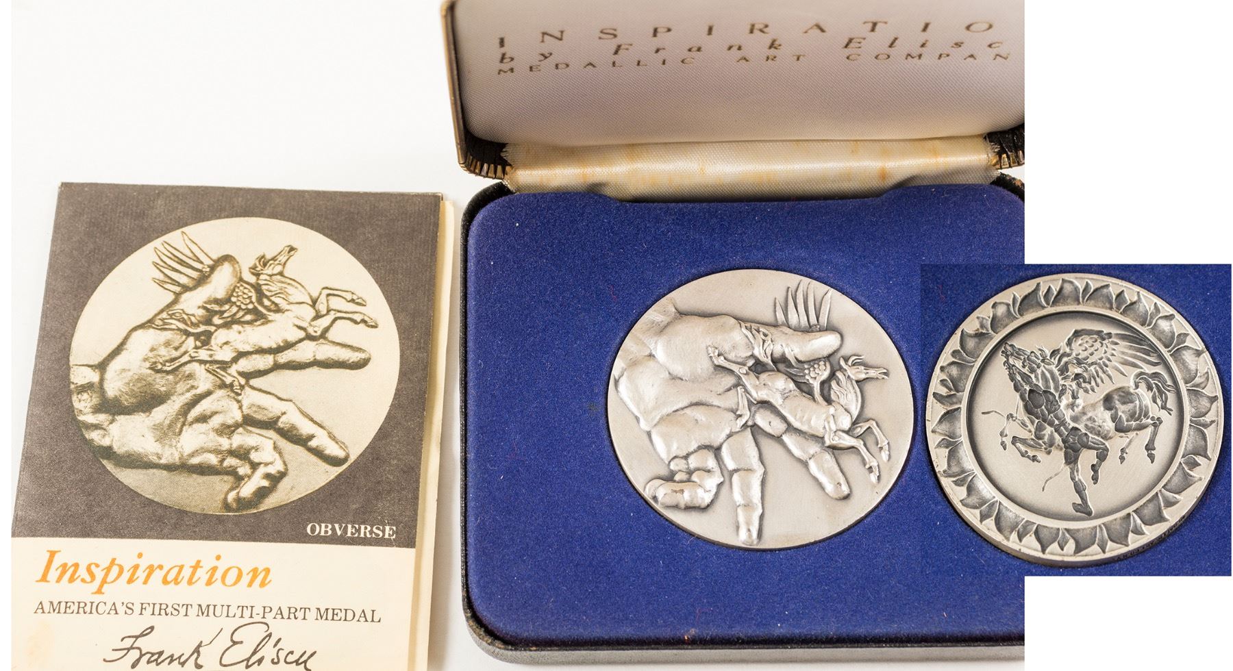Designed by Frank Eliscu for Medallic Art Company, in 1974. 3.4 troy ounces of .999 silver in original box with paperwork. Eliscu was the sculptor of the Heisman Trophy of football fame. Date: Location: HWAC# 58047