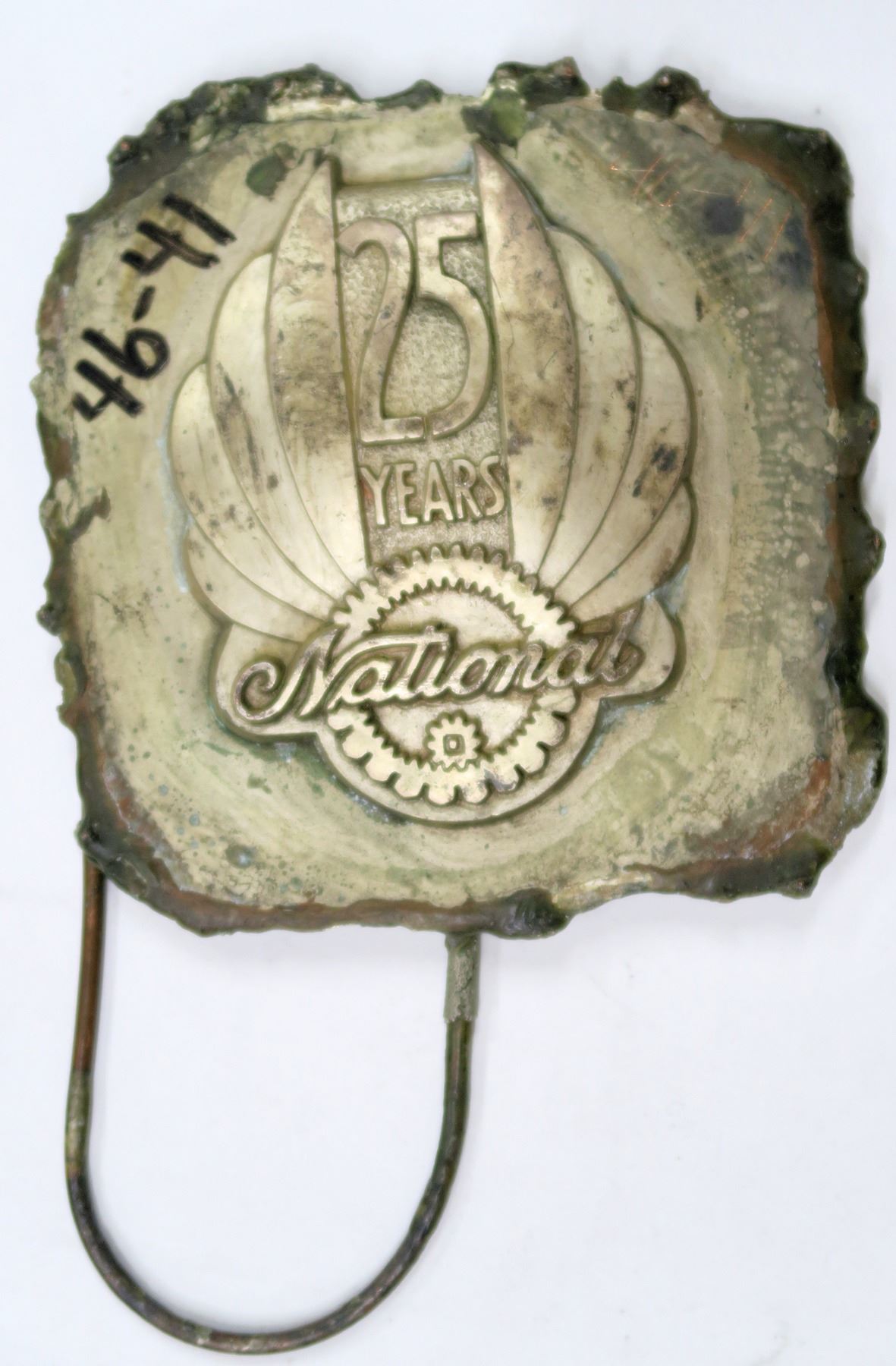 This is a galvano-positive made by Medallic Art Company for the 25th anniversary of National Cash Register in 1946. The design would have been identified as MACo 1946-041. No artist name is recorded with this design. Medallic Art Company was incorporated in New York City 1910 and produced medallic work of exceptionally high quality and design into the present day. In the first half of the 20th century, medallic models would be sculpted from wax, clay, or plaster and made into a plaster positive. This plaster positive would be sprayed with an electrically conductive material and electrolytically plated with a heavy layer of pure copper to produce a copper negative called a galvano. This was placed on a Janvier mechanical pantograph machine that would cut the negative pattern into a soft steel block which would later be hardened into a die that would produce the medallion in a hydraulic or mechanical press. The item in this lot is a galvano-positive made by plating the galvano-negative with a heavy layer of copper to make a galvano-positive. It could be cut out, plated in gold, silver, or brass, and used as an ornament on a award or decorative item. It is extremely rare for items like this to appear on the market, and it probably surfaced after the 2016 bankruptcy of Northwest Territorial Mint which had purchased Medallic Art Company in 2009. Approx 5 x 5 x 0.5 inches, and includes the original electrode wire still attached. 314.5 grams.