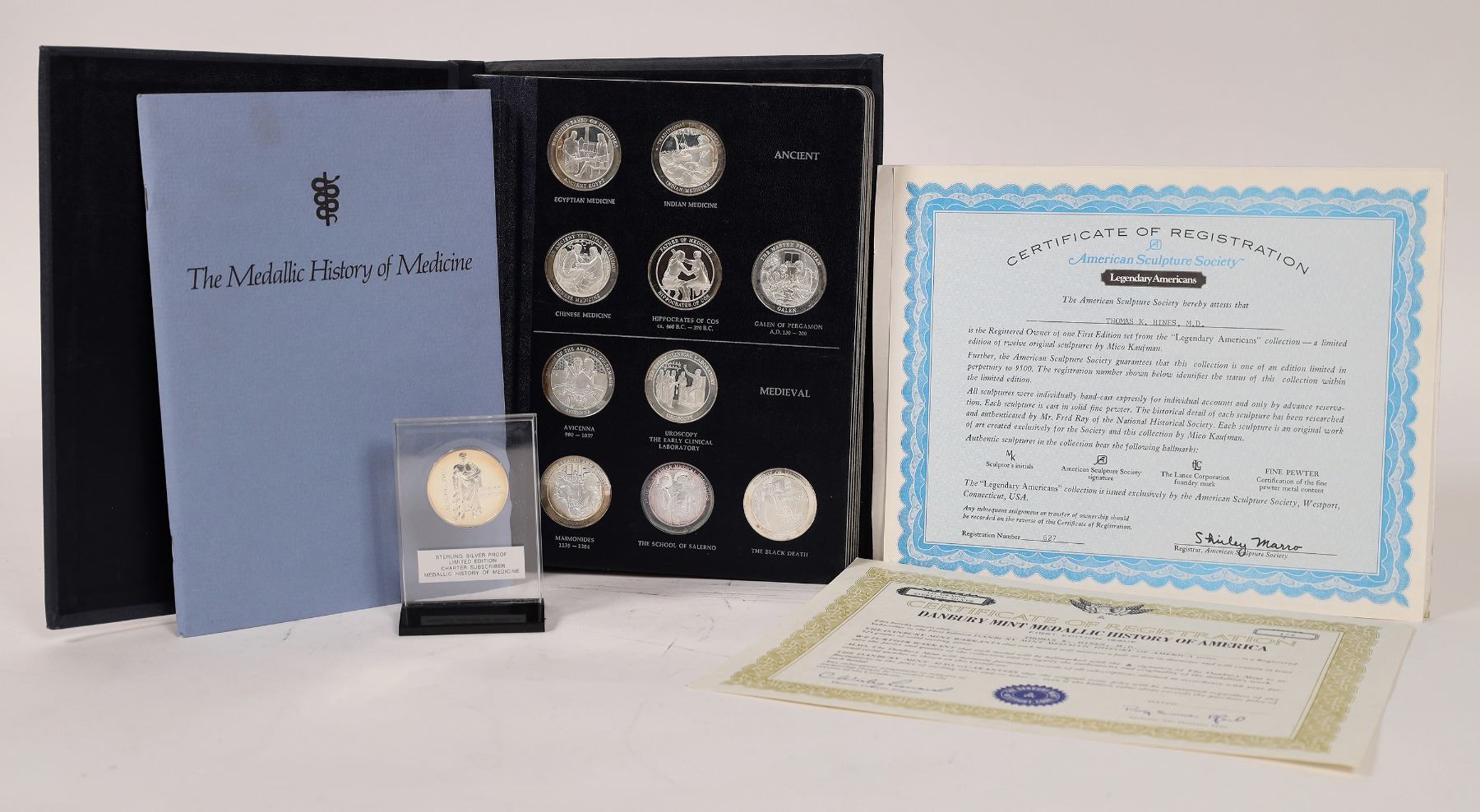Issued by Danbury Mint in 1972. Blue binder 9 x 1 x 2 inches with 60 sterling silver rounds depicting events in the history of medicine through human history. Each medal is 40 mm and contains 524 grains sterling silver. 63 page brochure "The Medallic History of Medicine" explains each piece. Also a sterling silver proof "God of Healing" medal in separate plastic case. 72 ounces of silver.