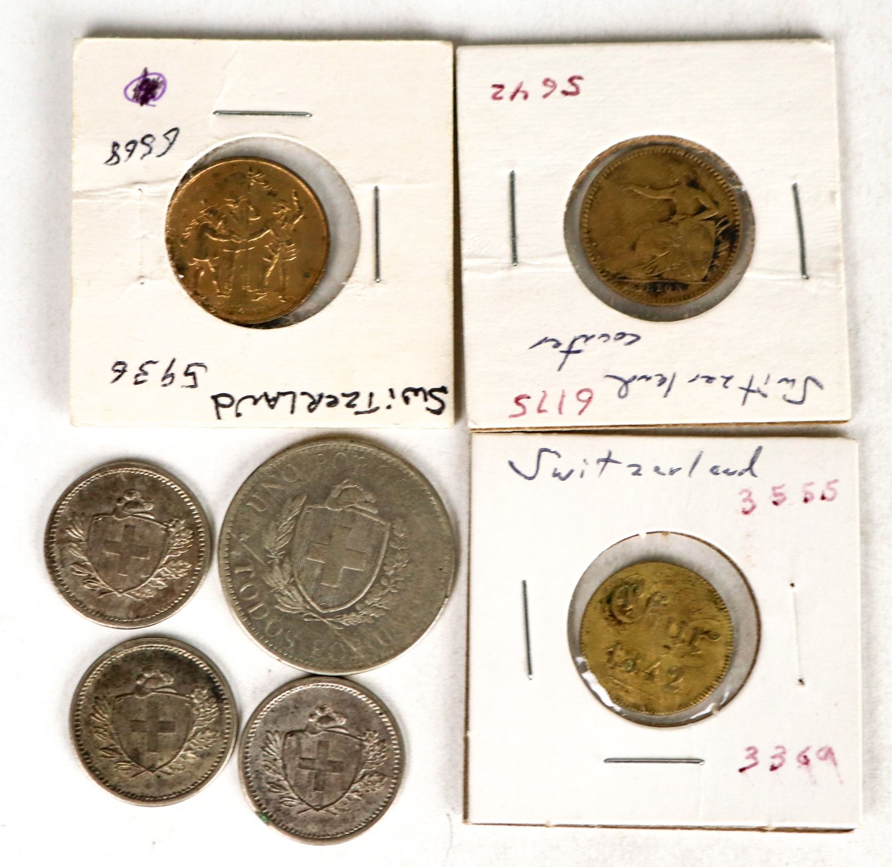 Seven medals from Switzerland: Chur / 1842; counter; Wih Wollen Sein Ein Einzig Volk Von Brudern (We want to be a united people of brothers); Cafe Suizo (4).[ Switzerland
