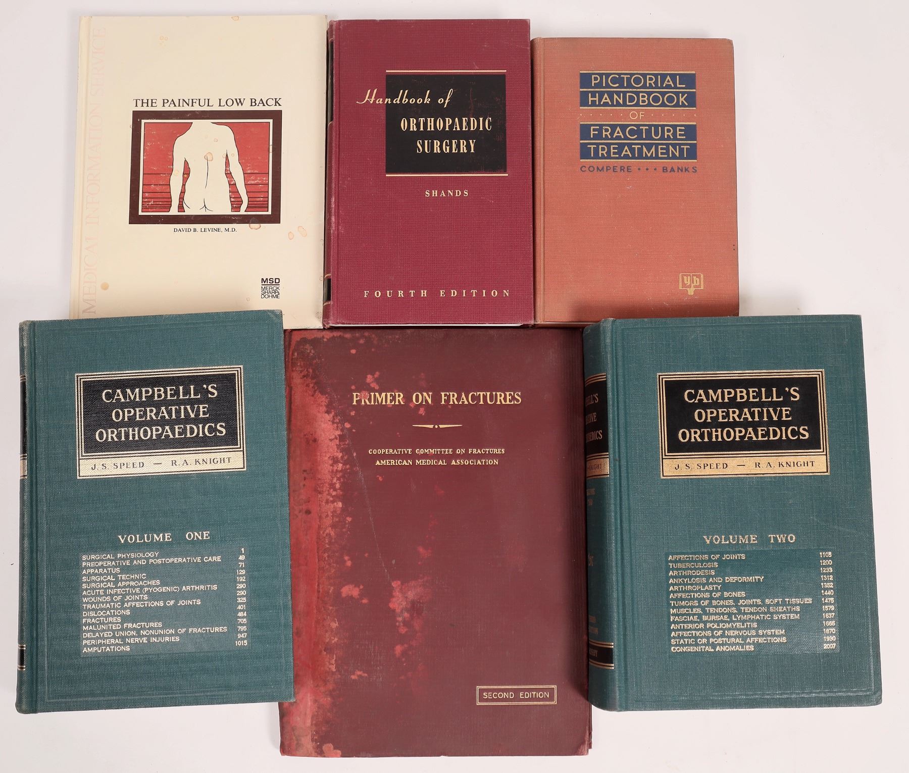 6 hardcovers. Pictorial Handbook of Fracture Treatment by Compere, 1943 351pp with index, x-rays and illustrations. The Painful Low Back by Levine, 1979 63pp. Handbook of Orthopedic Surgery by Shands, 1952 644pp with index. Primer on Fractures 1931-board issues. Campbell's Operative Orthopedics Vols 1 and 2,1956-lots of x-rays and operative photos. State: City: Date: Provenance: Stuart Mackenzie Montana Ephemera Collection