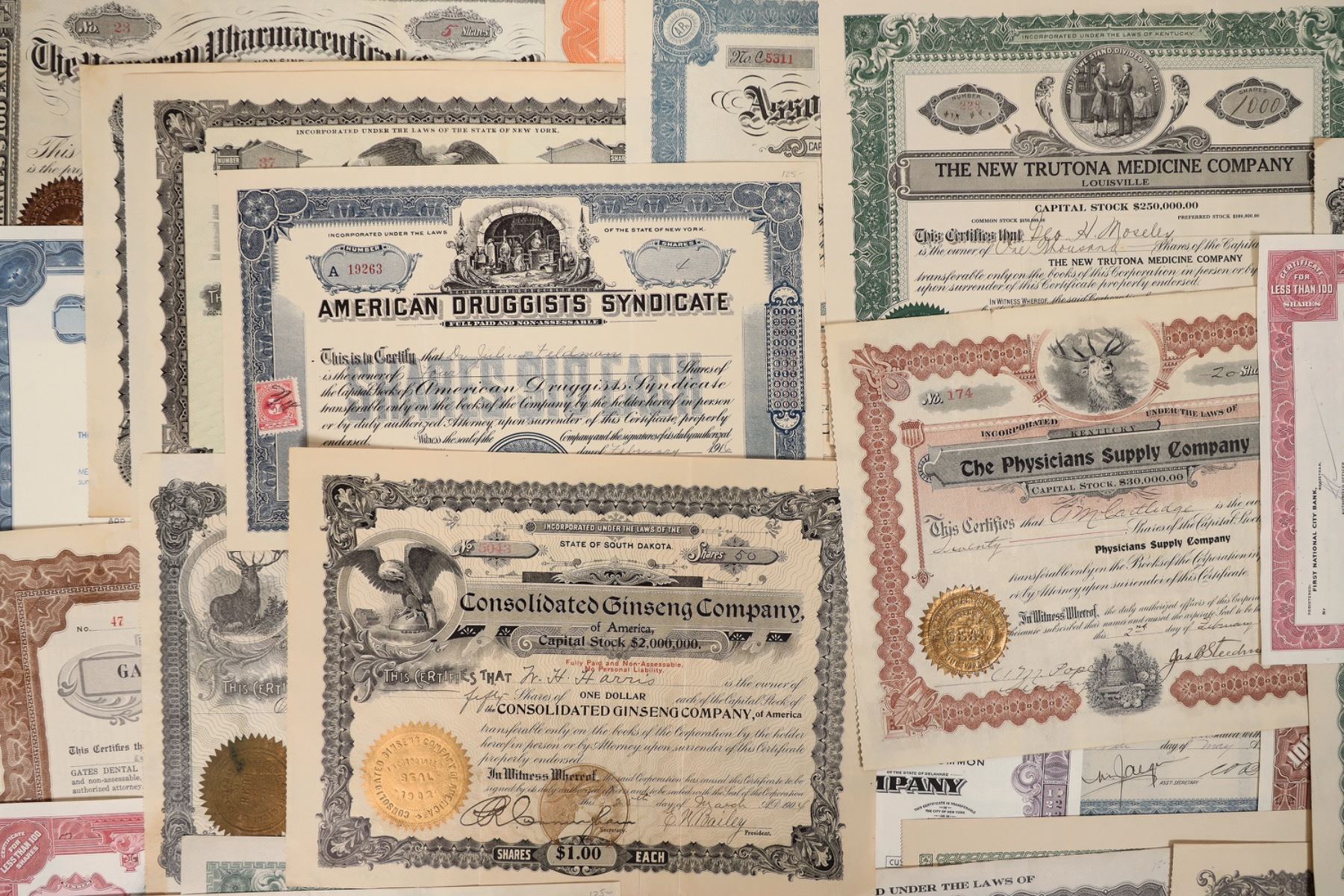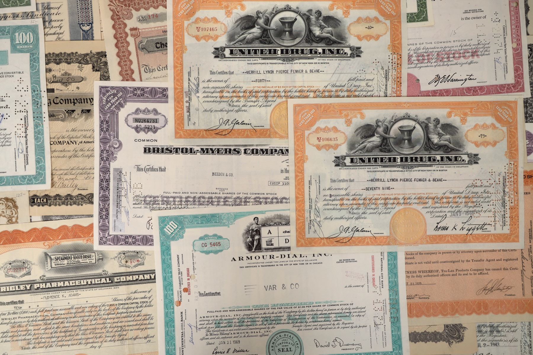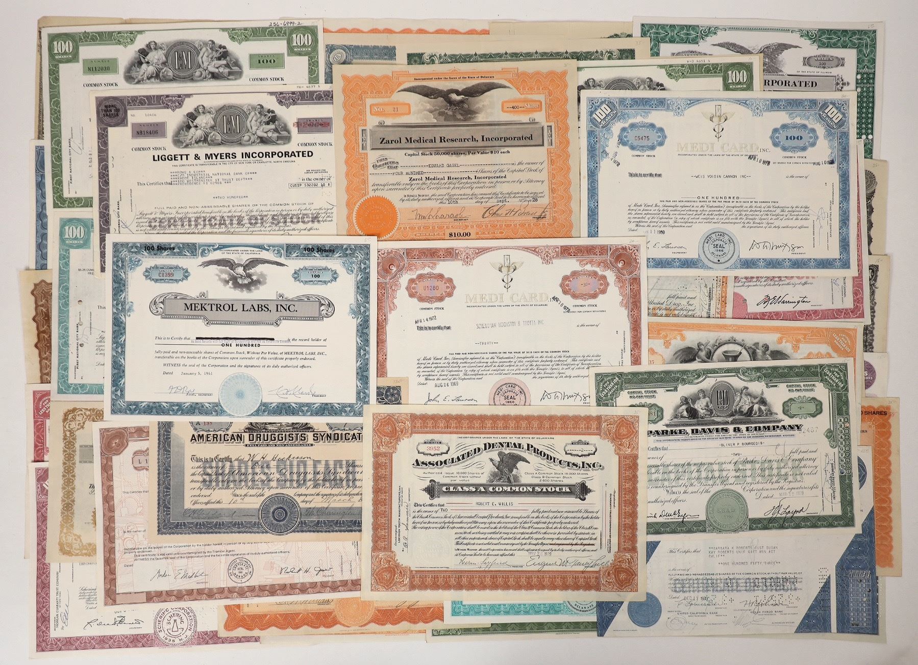Drug stock certificates include Bristol-Meyers Company 1971, The Keeler-Wilson Drug Company 1912, Associated Pharmacists Inc 1920, Jayzon Pharmacal Inc 1932, Mektrol Labs Inc 1961, Adams Pharmacy Company 1912 and many more. All are in good condition. Please see photos for more details.
