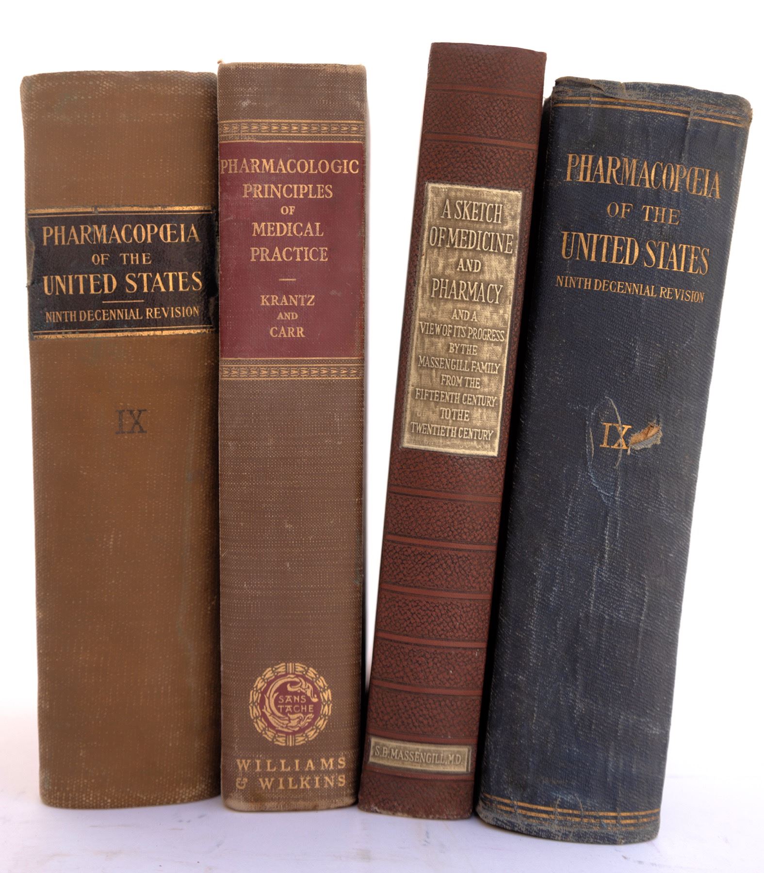 A) Two copies of the Pharmacopoeia of the United States of America Ninth Decennial Revision by Authority of the United States Pharmacopoeia Convention held at Washington, DC, May 10, 1910. 728 pages.