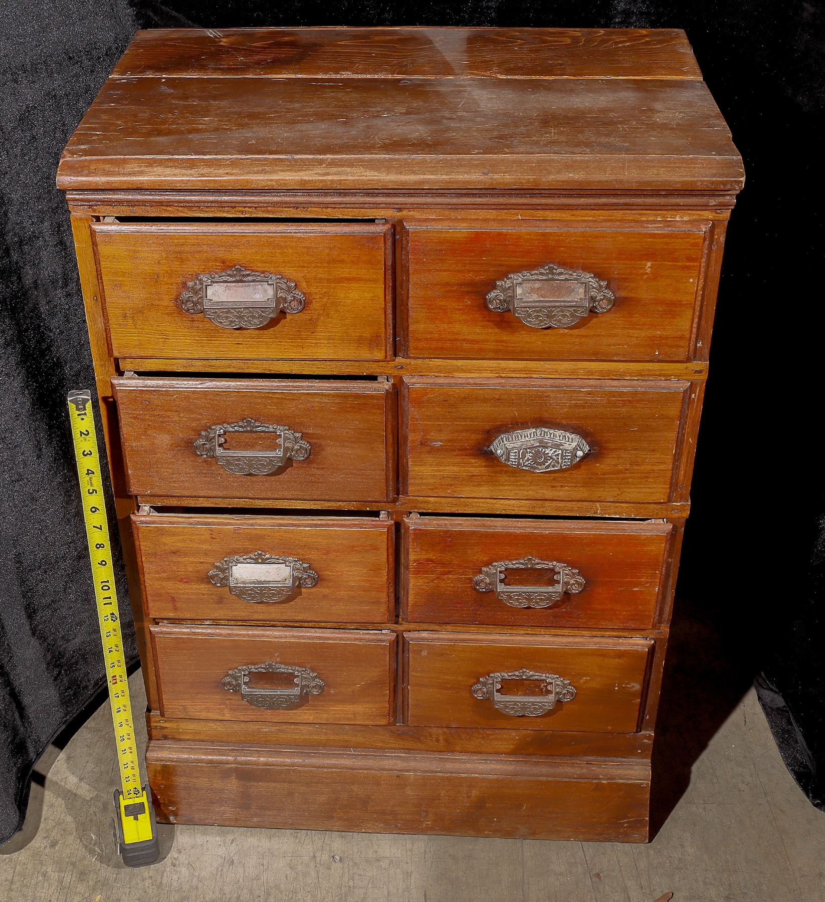 Medical style cabinet with eight uniformly sized drawers, each with a die-cast handle and a glass panel for a label. Three are missing the glass panels, and one drawer has a replacement handle. Made of pine with square nail construction. One panel at top has been replaced. Areas of the top have been trimmed to fit a custom location. c1900-1910. LOCAL PICK-UP IN RENO. Gary Bracken Collection
