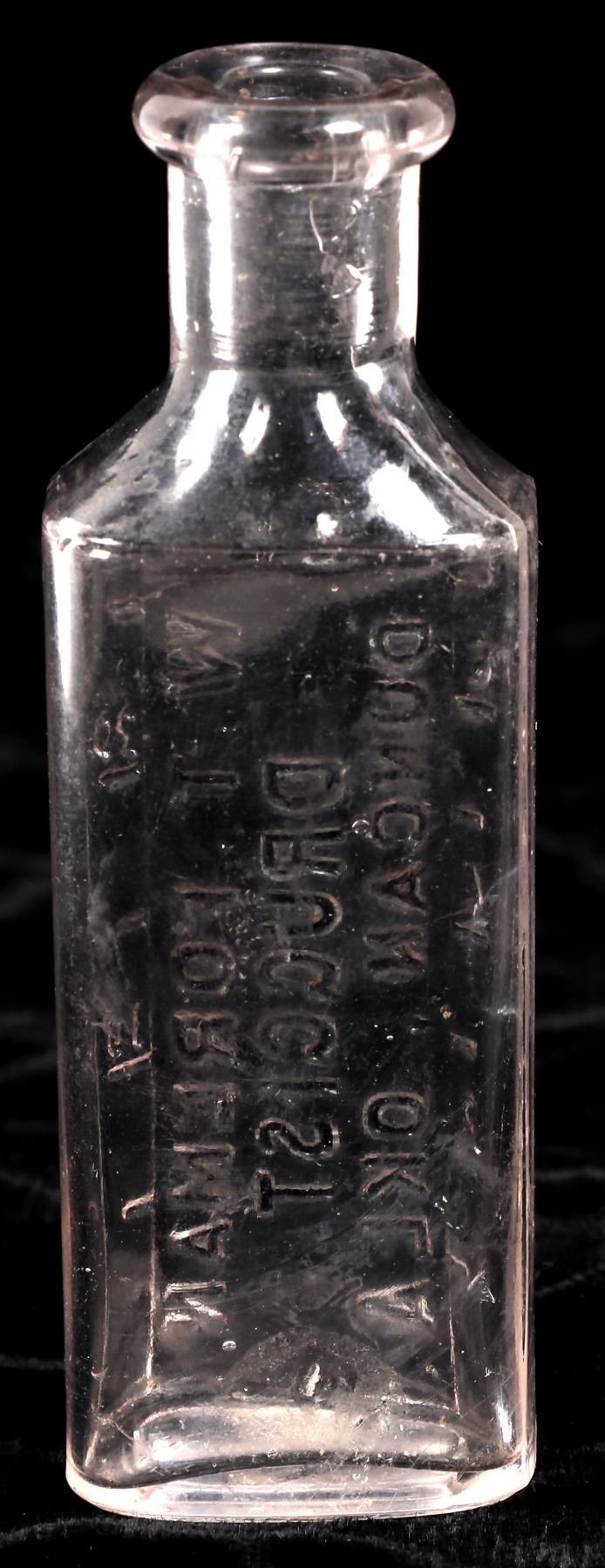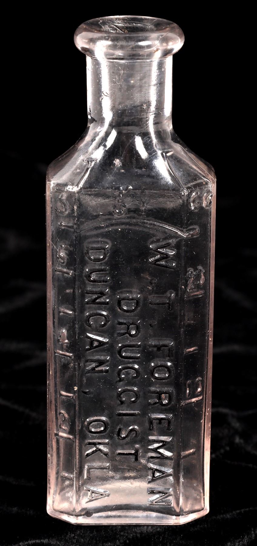 Black embossed W T Duncan/Druggist/Duncan, Okla bottle. 3.75" No apparent chips or cracks. Duncan Oklahoma