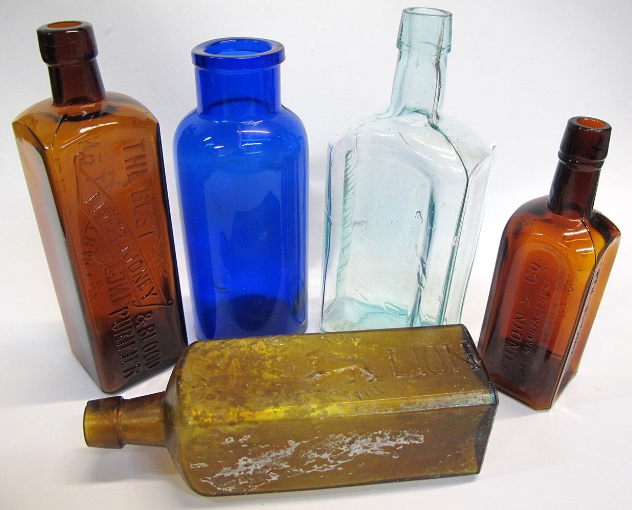 Amber WEB'S / CATHARTIC / A NO 1 TONIC. Cobalt unmarked wavy wide neck. Rectangular aqua EXTRACT OF / SARSAPARILLA / JOHN BULL / LOUISVILLE, KY. (small base chip). Amber rectangular DR. NYWALL'S / FAMILY MEDICINE // LUNDIN & CO. / SOLE MANUFACTURERS. Rectangular amber DR. THENARD // IRON / GOLD LION /TONIC. No other visible cracks or chips. Date: Location: HWAC # 54905