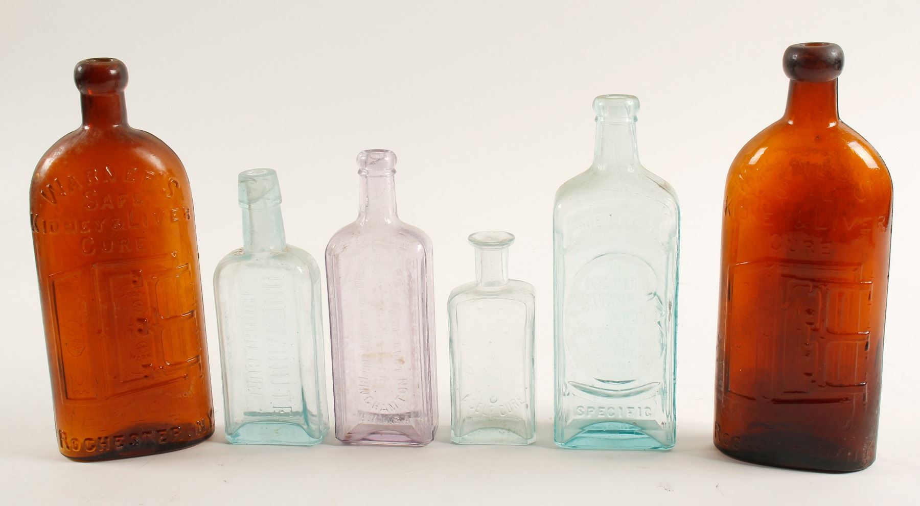Items # 1 & #2 of : Warner's ( au )/ Safe/ Kidney & Liver / Cure / Motif : Embossed safe, right hinges) Rochester, N.Y. // Medium yellow amber, oval , cure bottles. 9 / 3/8" tall, rounded collar, one is applied top, the other is a tooled top. Also, the applied top specimen, does not say " Trade Mark " on the safe !! Extremely rare. Dug specimens, with light overall haze, but no damage. Item # 3 of 6: The Great ( cu ) / Dr. Kilmer's / Swamp-/ Root/ Kidney/ Liver & Bladder ( au ) / Cure / Specific //Dr. Kilmer & Co. // Dr. Kilmer & Co//sp// Binghamton, NY. //Aqua, rectangular, medicine bottle. 8 1/4" tall, rounded collar with flange, tooled top. Attic specimen, with one small flake on the bevel, 1/8" in size. Really nice , front shoulder bubble, dead center. Item # 4 of 6 : Dr. Kilmer's ( au) / Embossed vertically is: swamp Root / Kidney & Liver/ And Bladder Cure / Binhamton ( Ad) / N.Y U.S.A.//sp//sp//sp//. Light , sun colored amethyst, rectangular, cure bottle. 7 1/8" tall, rounded collar with flange, tooled top. Great condition, only light inside haze, never cleaned. Item # 5 of 6": One Minute / Cough Cure //E.C. De Witt & Co // sp //Chicago, U.S.A.// Aqua, rectangular, cough cure bottle. 6 5/8" tall, long tapered collar, tooled top. Dug specimen, with light haze. No damage. Item # 6 of 6: The / Specific ( au ) / A NO 1 / a Self Cure ( ad ) / Trade Mark // f//f//f//. Aqua , rectangular, cure bottle. 5" tall, flared lip, tooled top. Base embossed : W.T.Co / 1/ U.S.A. // Has a few minute scratches, otherwise nice. Nice collection of medicine bottles, in different color and shapes. Also, some nice rarities. ( RH ). City: State: Date: 1880's -1900.