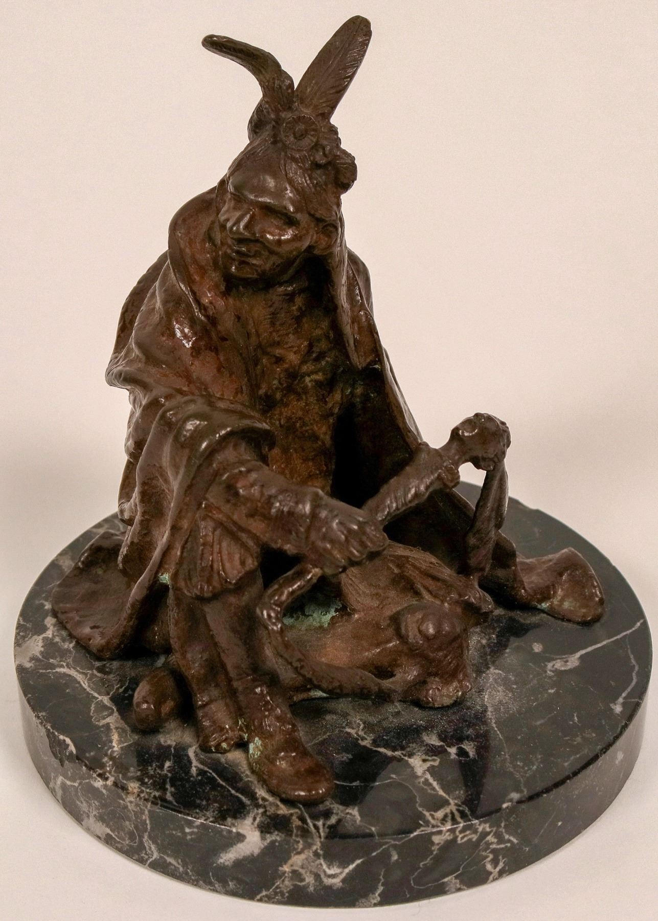 Very fine bronze of Native American Medicine Man. 6.5" x 5" x 4.5" on round marble base, 6" diameter. Signed by Carl Kauba. Kauba was born in Vienna in 1865, died in 1922.He never visited America, but was inspired by Native American objects that an American friend sent him as gifts.