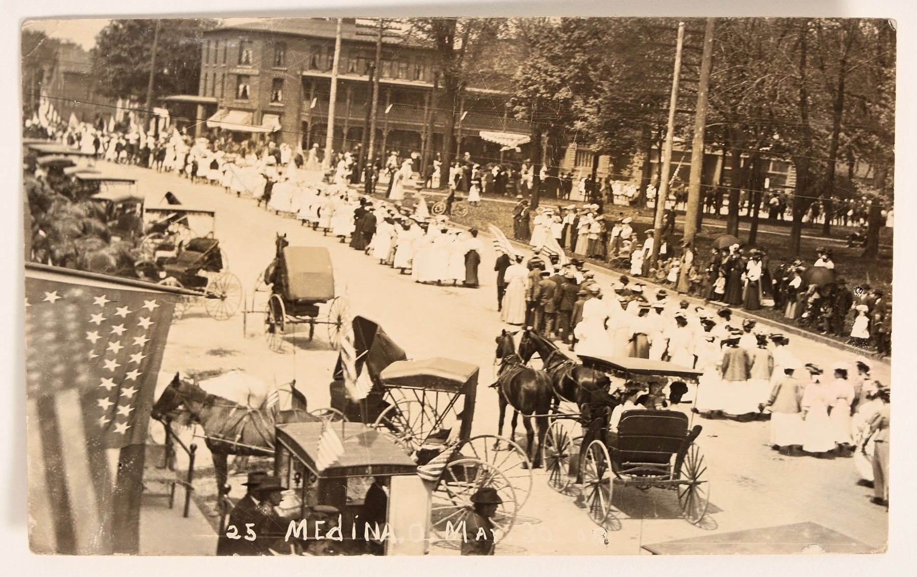 6 Medina postcards. RPC's- parade, church, public library. Also, Bee Hive Industry, The Park, S. Court Street.[ Medina County Ohio