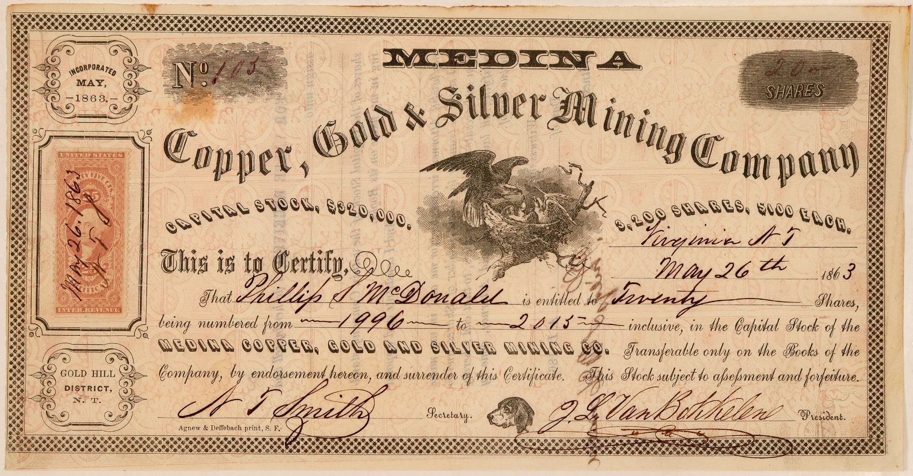 Beautiful Nevada Territorial stock certificate issued at Virginia, N.T. to Philip S. McDonald for 20 shares, May 26th, 1863. Signed by J.L. Van Bokkelen as president and N.T. Smith as secretary. Vignette of an eagle in a nest and a dog at the bottom. Pink background with adhesive revenue at the left. The Medina is not shown on the Becker map of 1882. General Jacob Van Bokkelen was a member of the original Territorial council, and a Virginia City resident in the early 1860's. He was later an agent for explosives powder, a job which led to his death in June 1873 when nitroglycerin he was storing in a Virginia City building detonated and killed 10 people. None of the others are listed in the San Francisco or Nevada directories of the period. The company is listed in Collins with Jacob's brother William listed as secretary. Endorsed on the back, but uncancelled. Very fine.