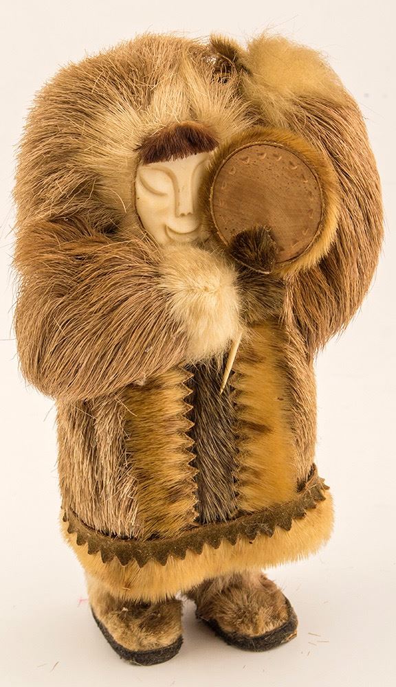 Seal skin coat and mukluks. Hand carved ivory face. 10" tall. 6" across. Please see photograph.