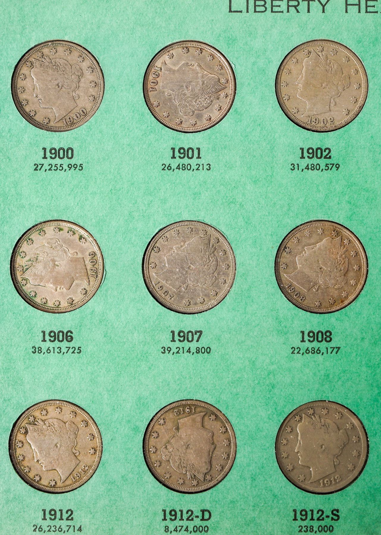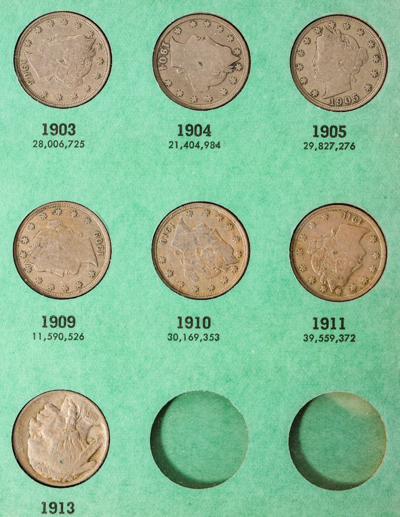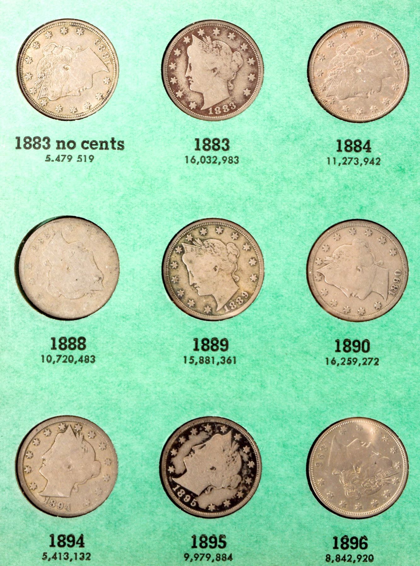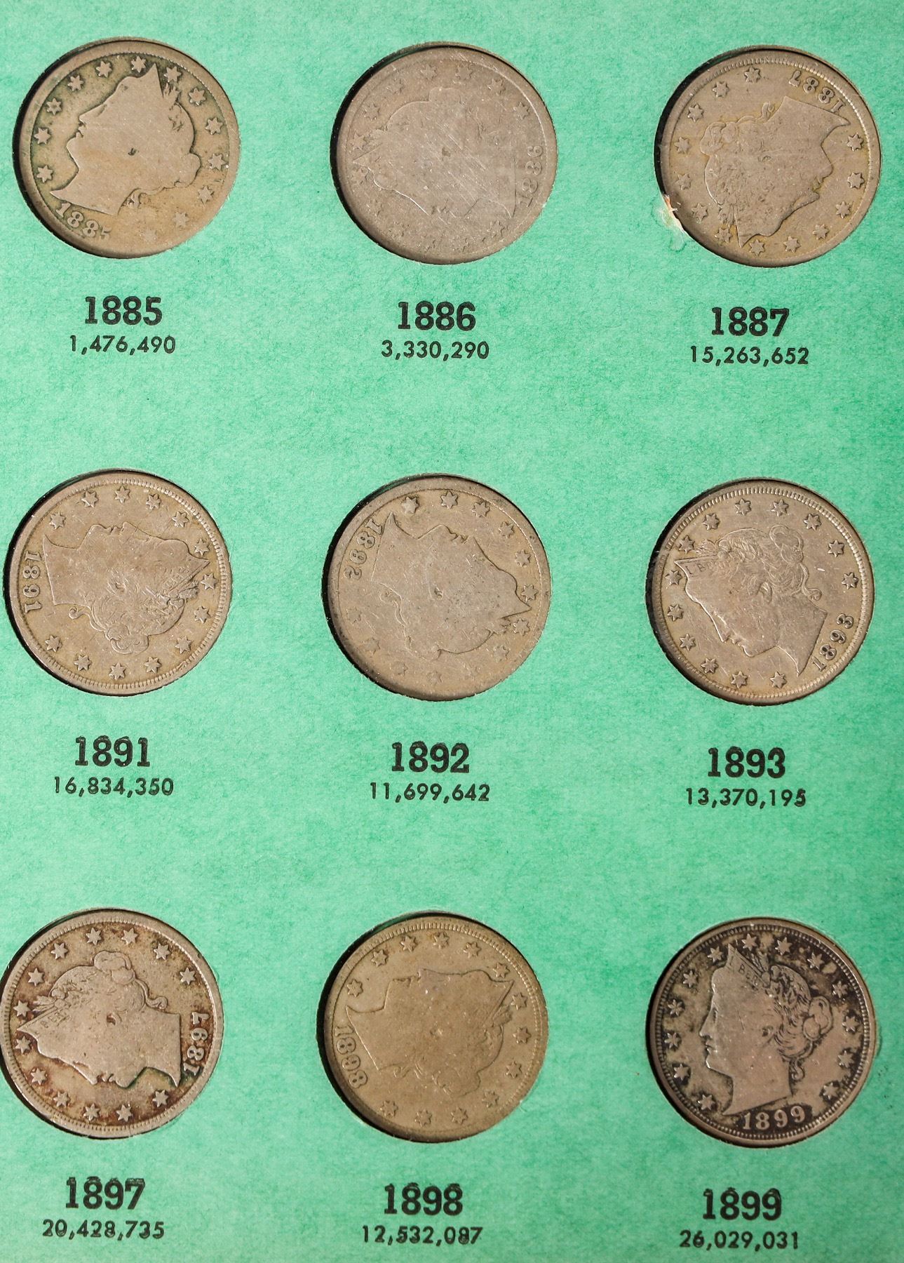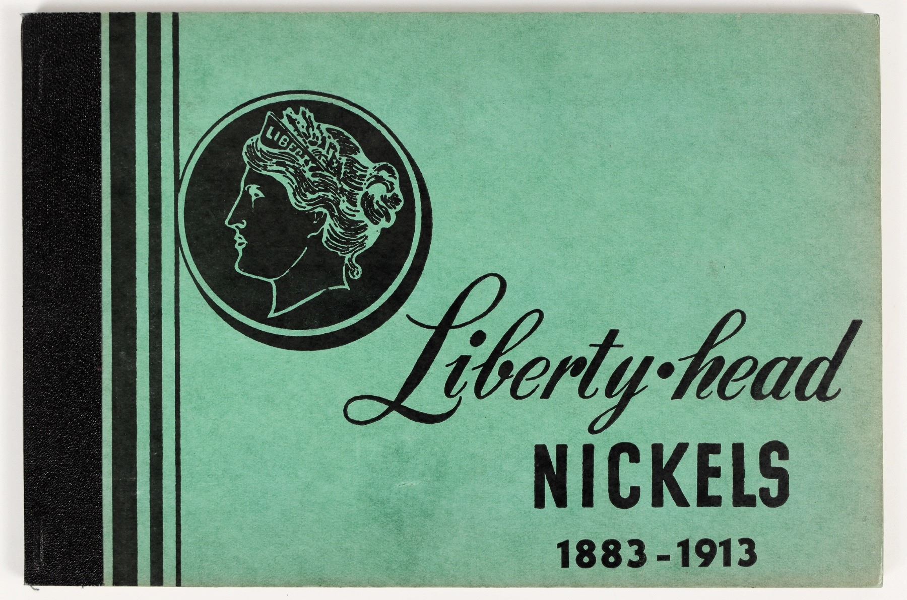 Vintage green Meghrig coin album "Liberty Head Nickels 1883-1913". Choice well balanced set with key dates 1885, 1886, 1912-S present. Set averages F+ condition. 19 coins with full Liberty. 34 coins total.