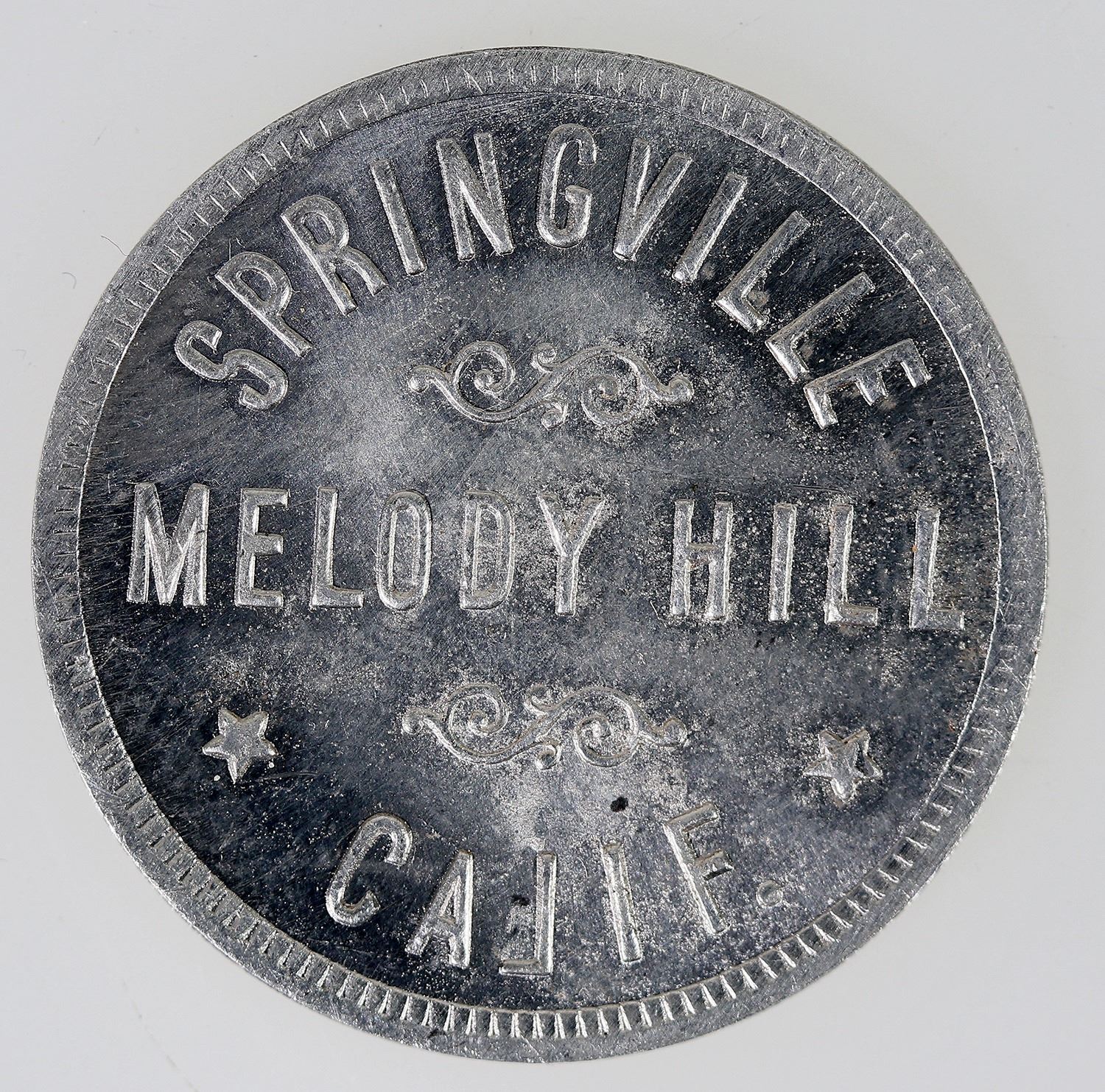Round aluminum Anillo uniface token from Tulare County: Springville / Melody Hill / Calif. 28 mm.