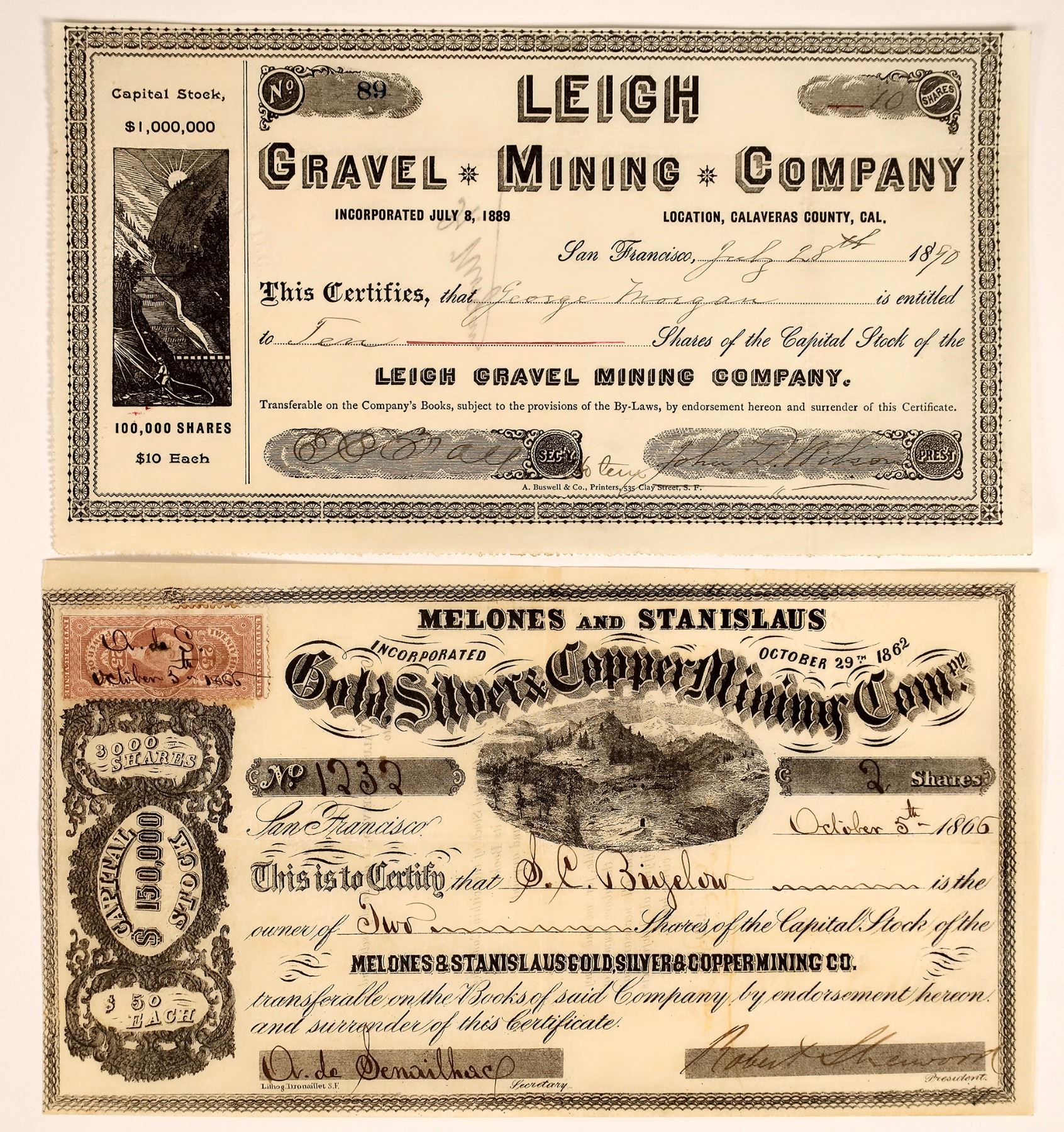 1) Melones and Stanislaus Gold, Silver & Copper Mining Company. Extra rare and very early. Incorporated October 29, 1862. No. 1232, issued for 2 shares to SC Bigelow in 1866 in San Francisco. Signed by secretary DC Sebailhack and president Robert (?). Not cancelled. 25c Bond revenue stamp. Black border and print, mountain vignette. Drouaillet printer. Folds. On April 27, 1863 the Sacramento Daily Union reported that the Melones and Stanislaus had discovered richer quartz than had ever been discovered before in that famous locality at Carson Hill. Carson Hill, by the way, went by Melones and Stanislaus Flat in its early days. VF. 2) Unissued Leigh Gravel & Mining Company stock. 1890. Incorporated in 1889. Nice gravel mining vignette on left.